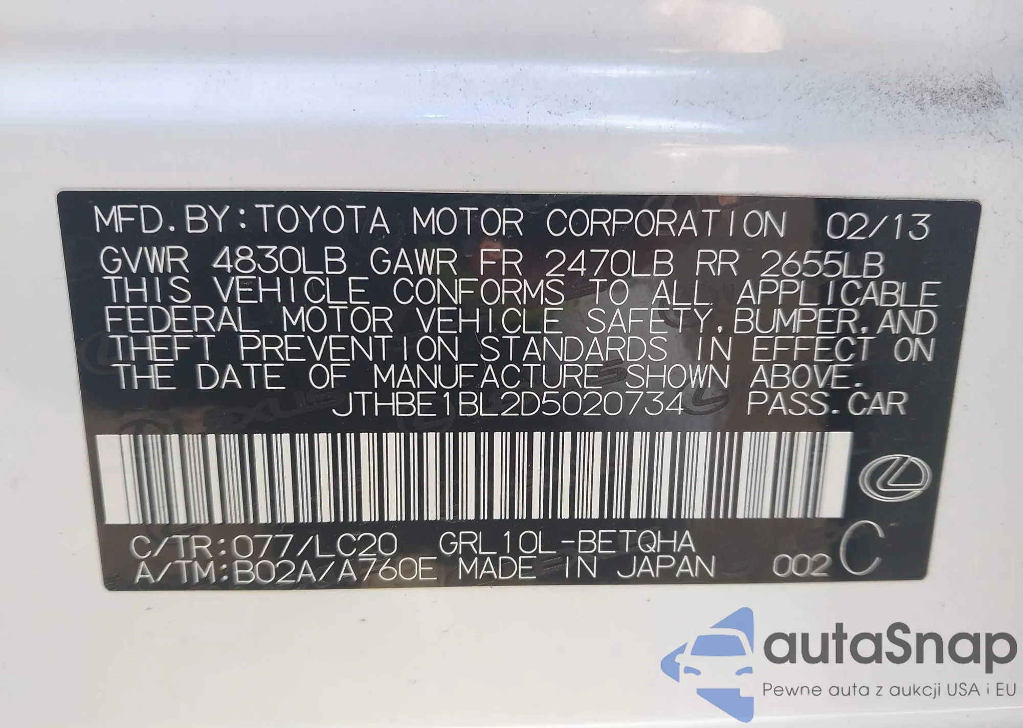 The car Lexus GS 2013 (VIN JTHBE1BL2D5020734) has not been auctioned before. The documents are clean, and the mileage matches or is below the market average. Sold by an insurance company – we recommend purchase. Delivery to the port will take approx. 6–8 weeks.