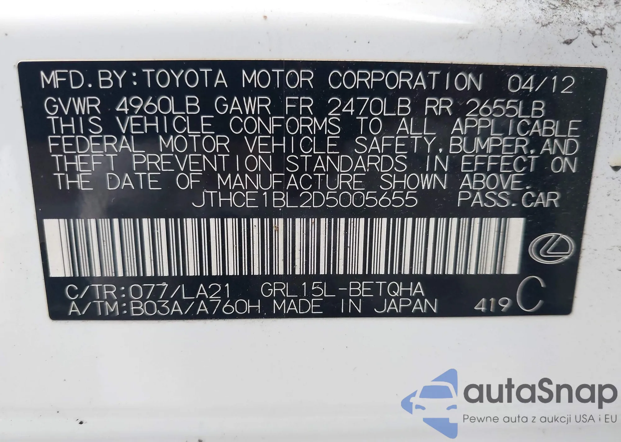 VIN: JTHCE1BL2D5005655