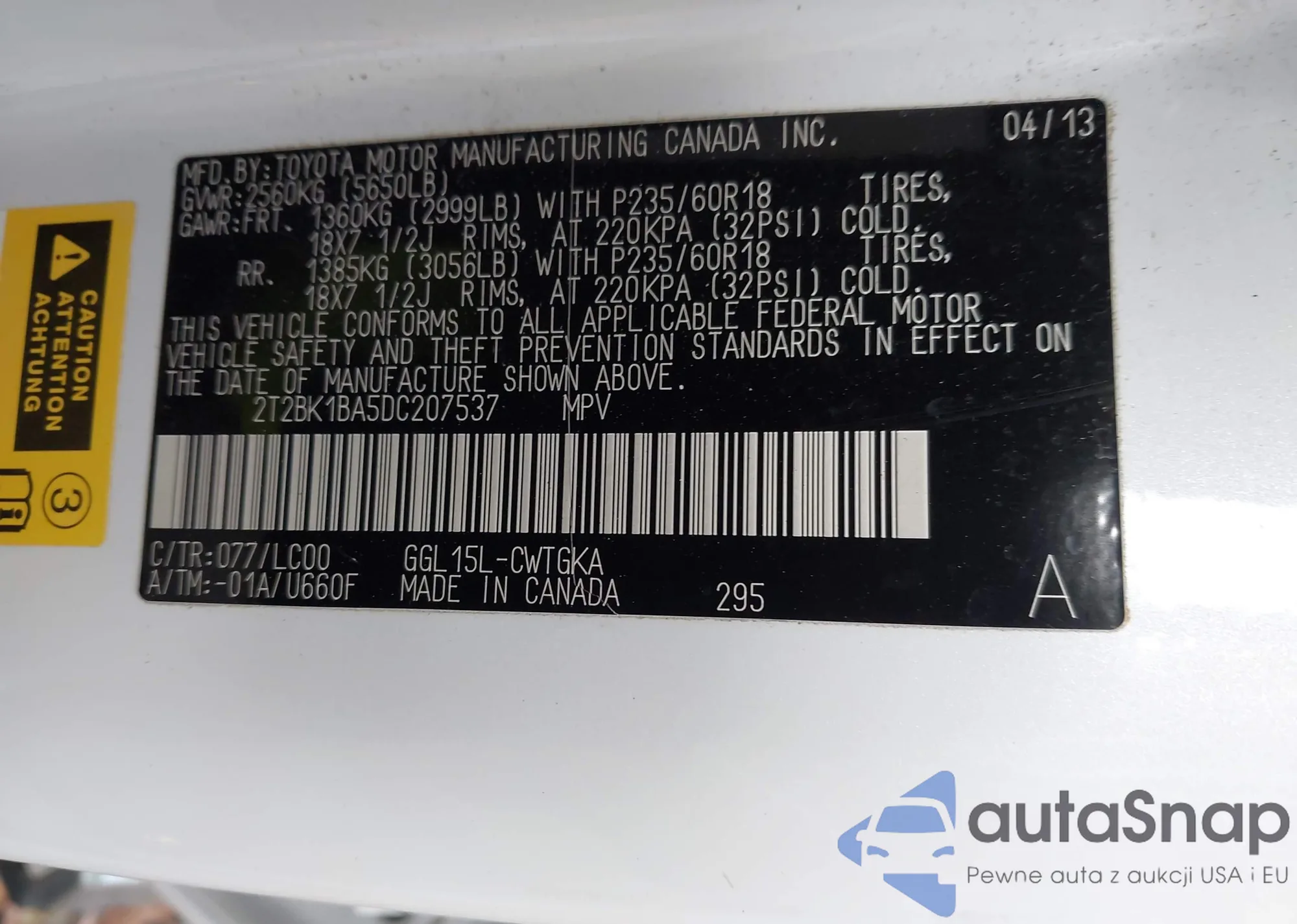 • VIN: 2T2BK1BA5DC207537