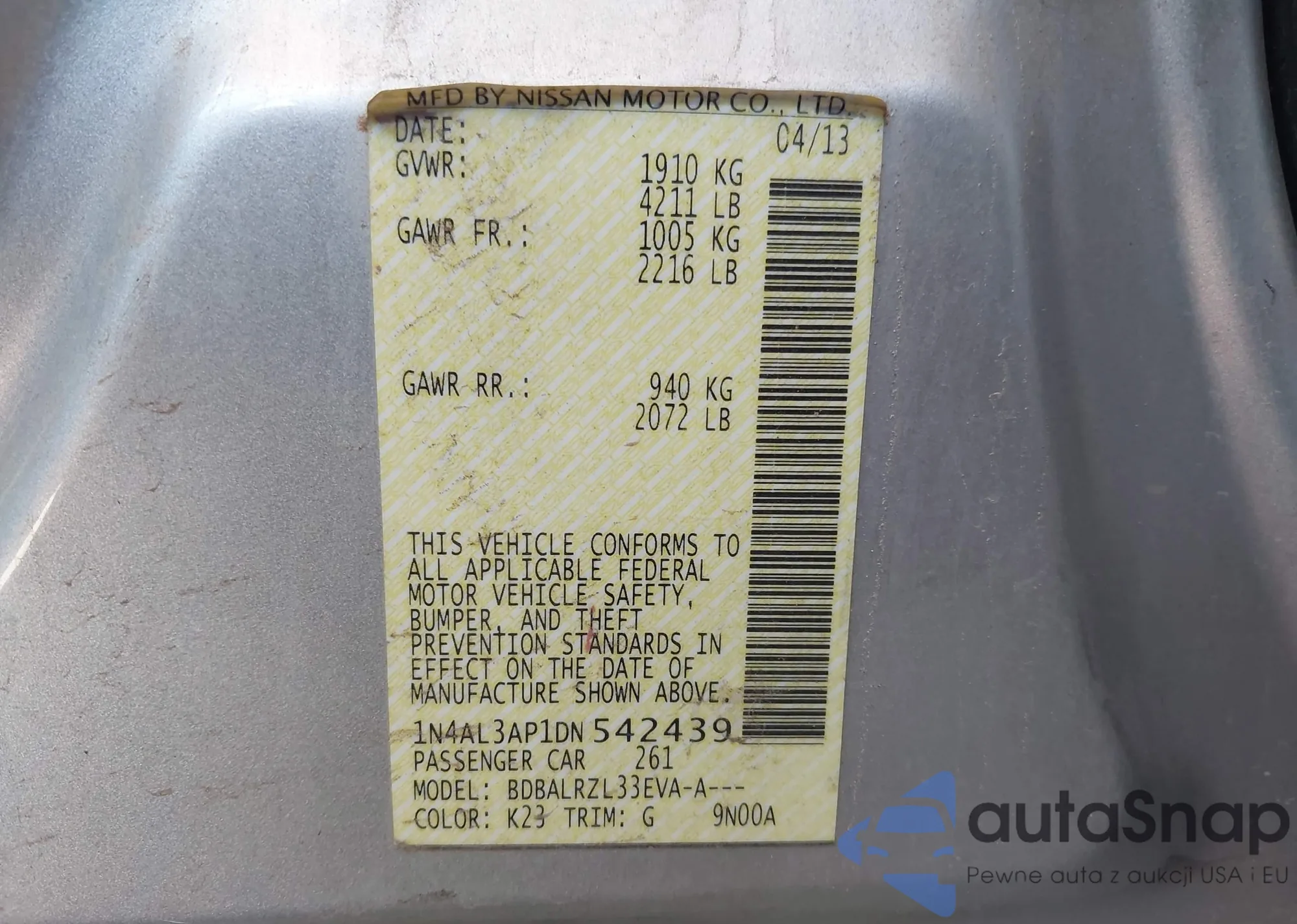• VIN: 1N4AL3AP1DN542439