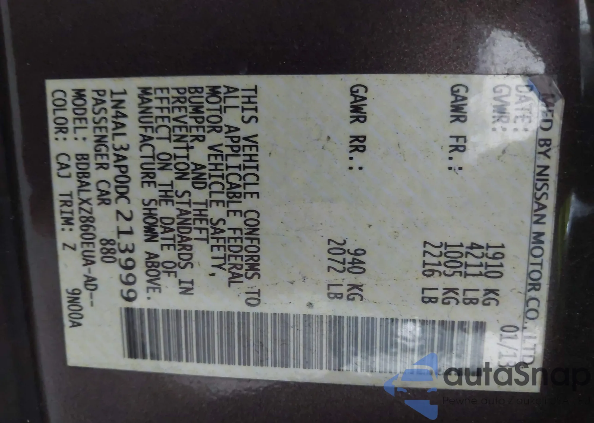 VIN: 1N4AL3AP0DC213999