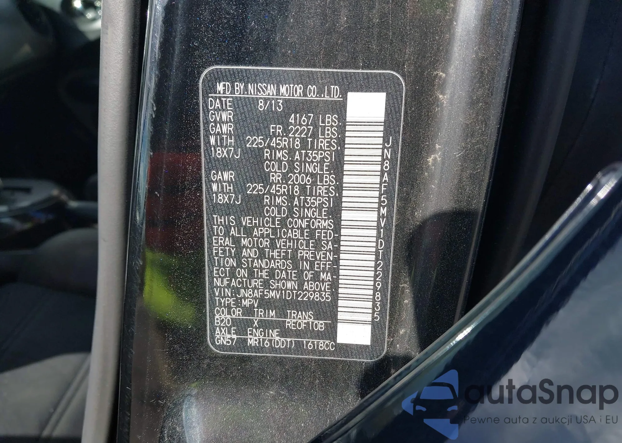 The car Nissan Juke 2013 (VIN JN8AF5MV1DT229835) has not been auctioned before. The documents are clean, and the mileage matches or is below the market average. Sold by an insurance company – we recommend purchase. Delivery to the port will take approx. 6–8 weeks.