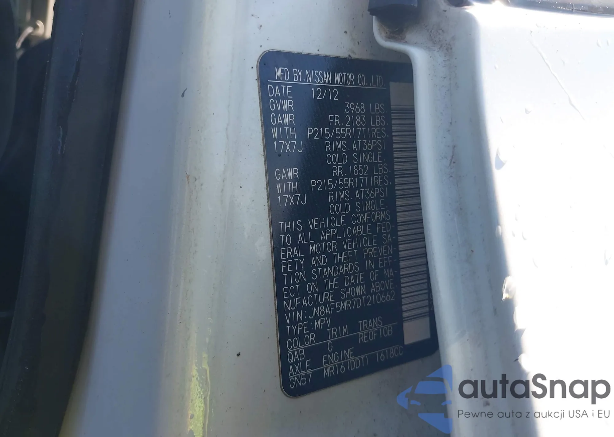 The car Nissan Juke 2013 (VIN JN8AF5MR7DT210662) has not been auctioned before. The documents are clean, and the mileage matches or is below the market average. Sold by an insurance company – we recommend purchase. Delivery to the port will take approx. 6–8 weeks.