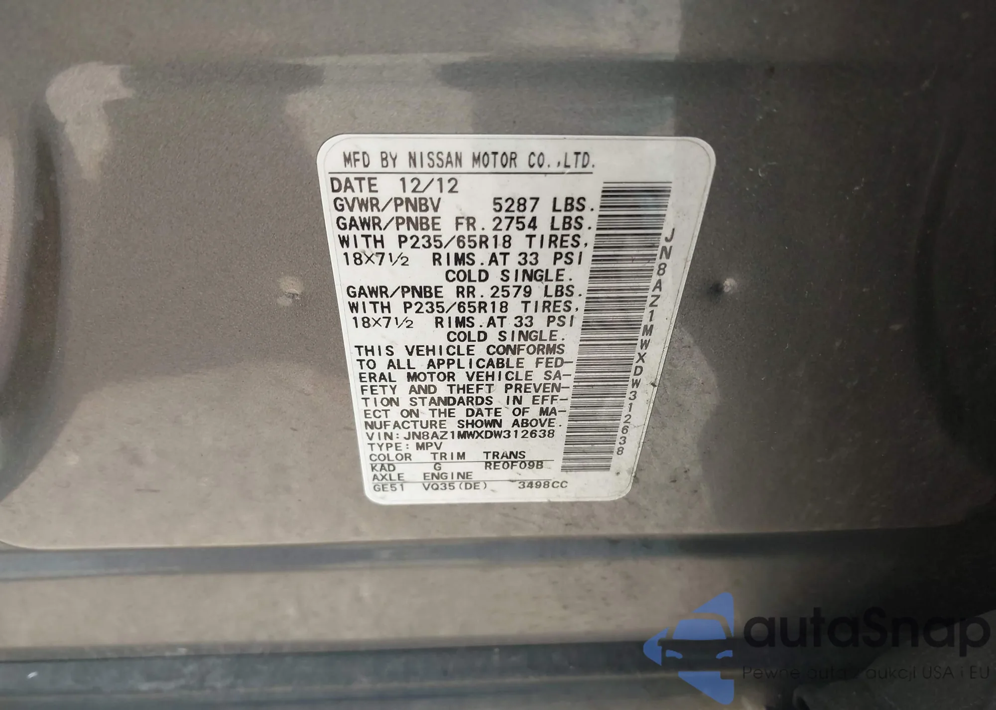 VIN: JN8AZ1MWXDW312638