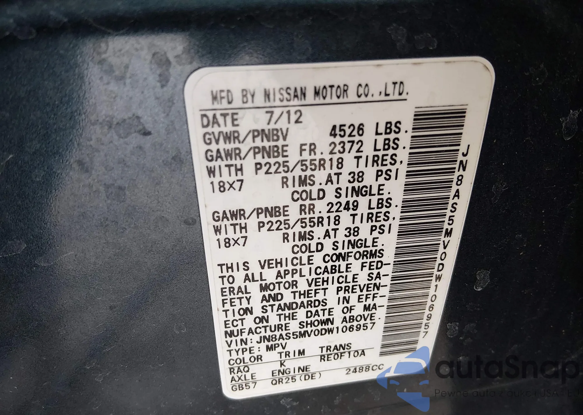 The car Nissan Rogue 2013 (VIN JN8AS5MV0DW106957) has not been auctioned before. The documents are clean, and the mileage matches or is below the market average. Sold by an insurance company – we recommend purchase. Delivery to the port will take approx. 6–8 weeks.
