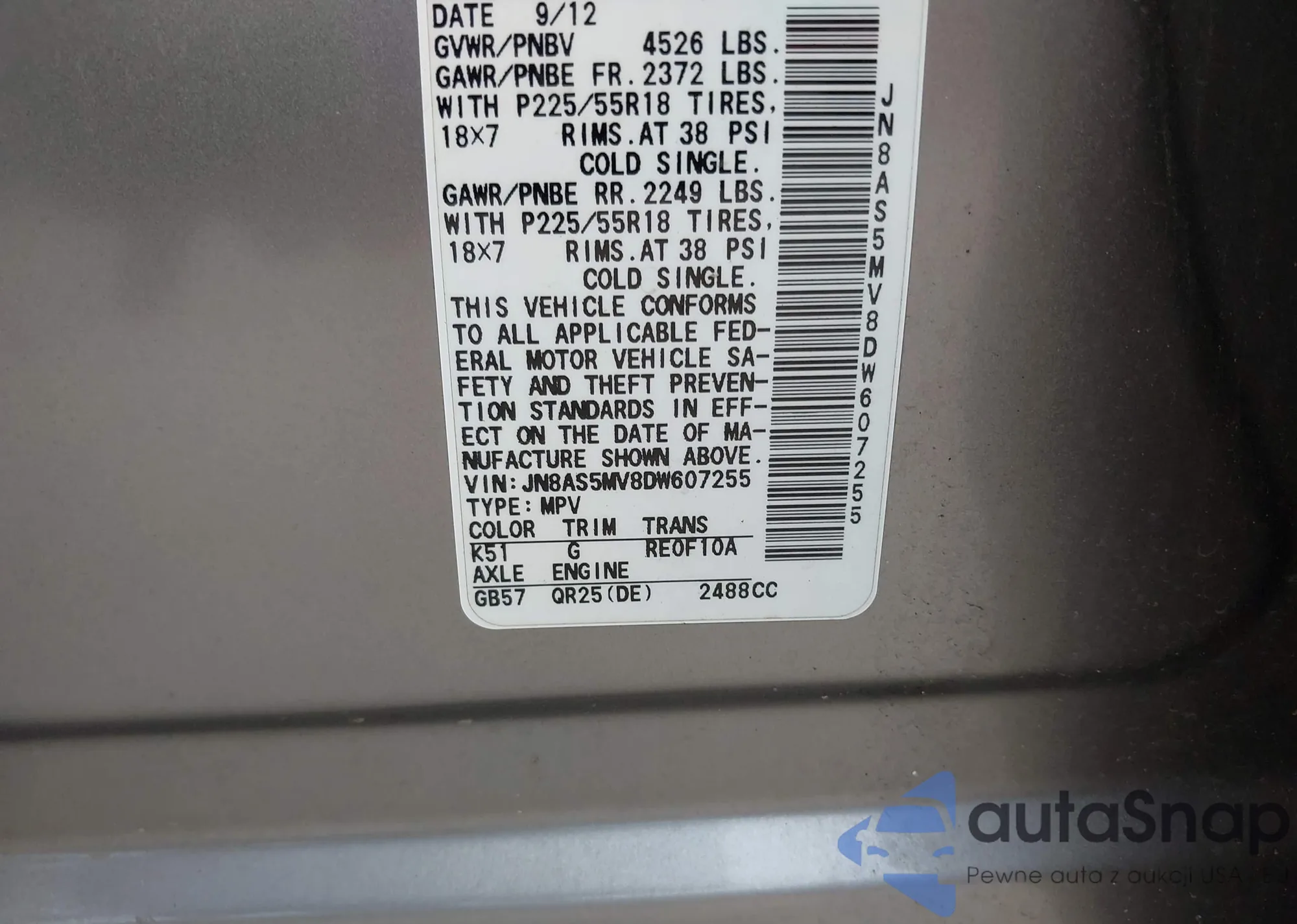 VIN: JN8AS5MV8DW607255