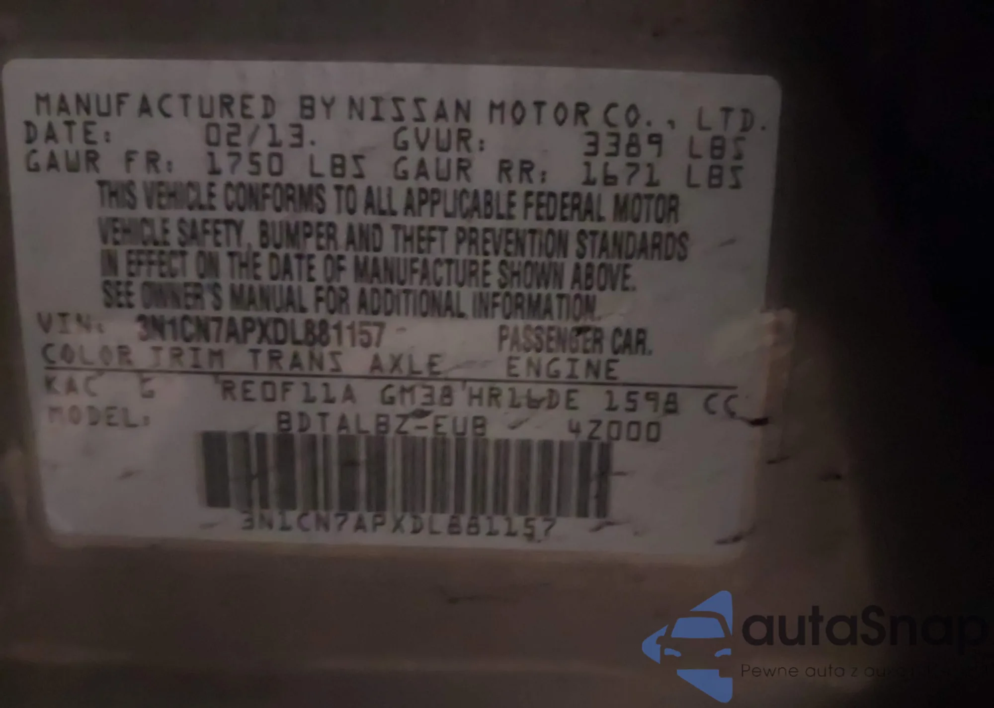 The car Nissan Versa 2013 (VIN 3N1CN7APXDL881157) is sold by an unverified seller. We recommend checking the Carfax report and confirming registration possibilities before purchase.