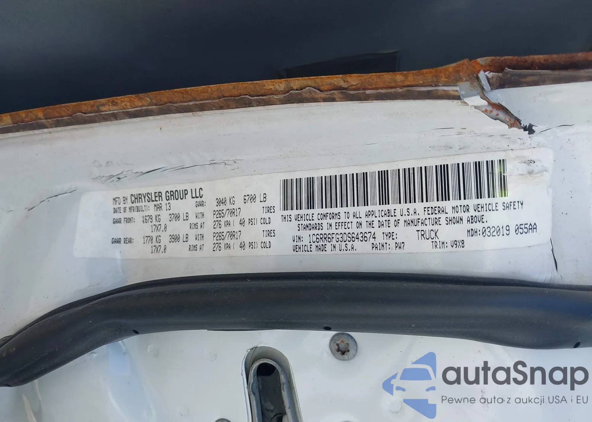 The car RAM 1500 2013 (VIN 1C6RR6FG3DS643674) has not been auctioned before. The documents are clean, and the mileage matches or is below the market average. Sold by an insurance company – we recommend purchase. Delivery to the port will take approx. 6–8 weeks.