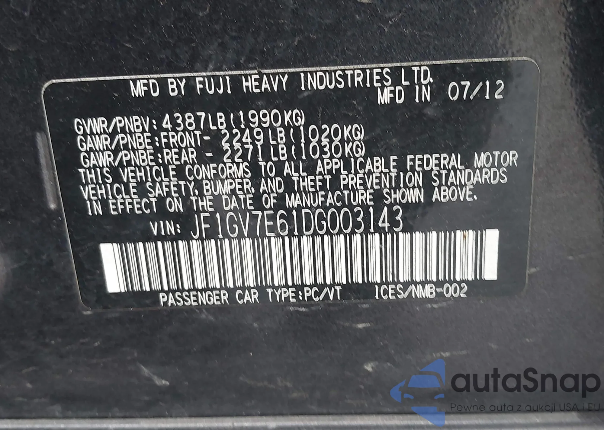 The car Subaru Impreza WRX 2013 (VIN JF1GV7E61DG003143) has documents that prevent registration. Export and registration may be difficult. Contact AutaSnap experts to find alternatives.