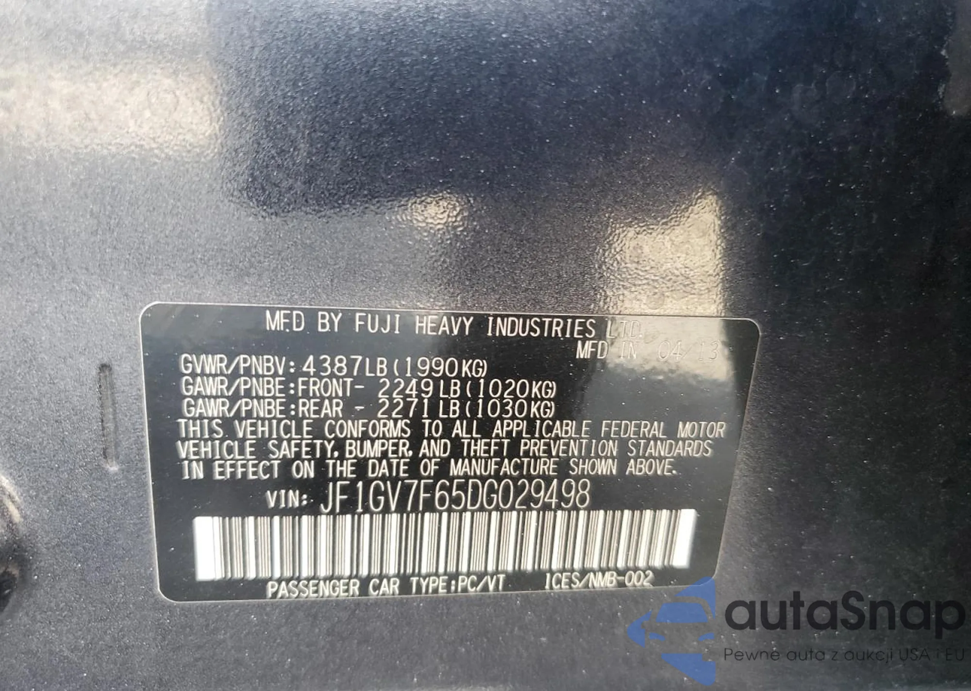 The car Subaru Impreza 2013 (VIN JF1GV7F65DG029498) is sold by an unverified seller. We recommend checking the Carfax report and confirming registration possibilities before purchase.