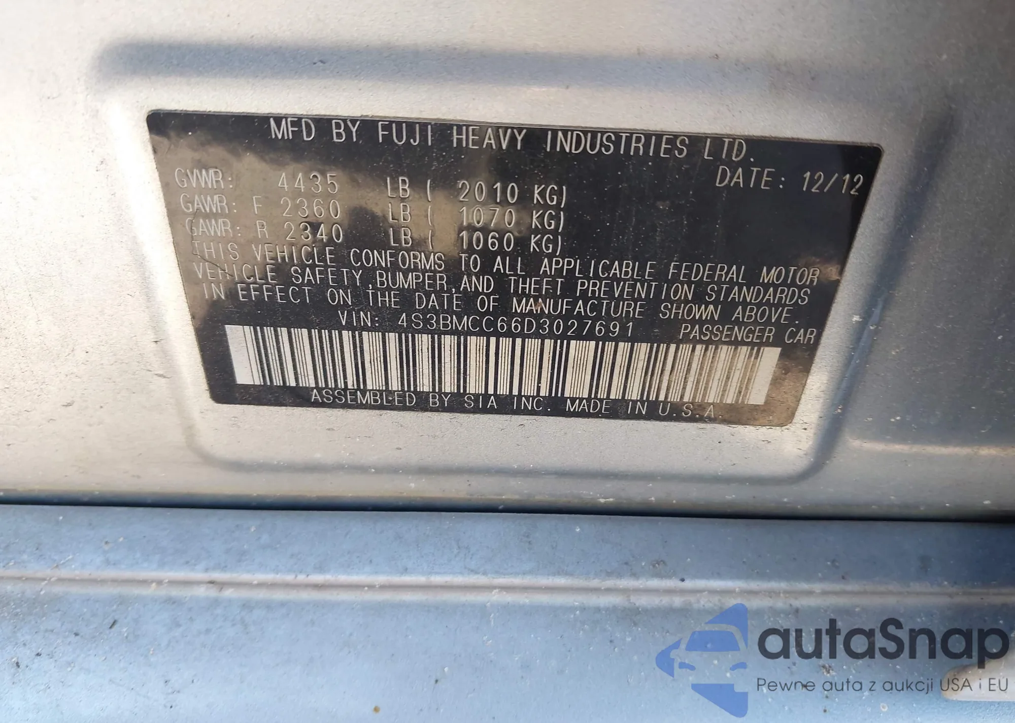 The car Subaru Legacy 2013 (VIN 4S3BMCC66D3027691) is sold by an unverified seller. We recommend checking the Carfax report and confirming registration possibilities before purchase.