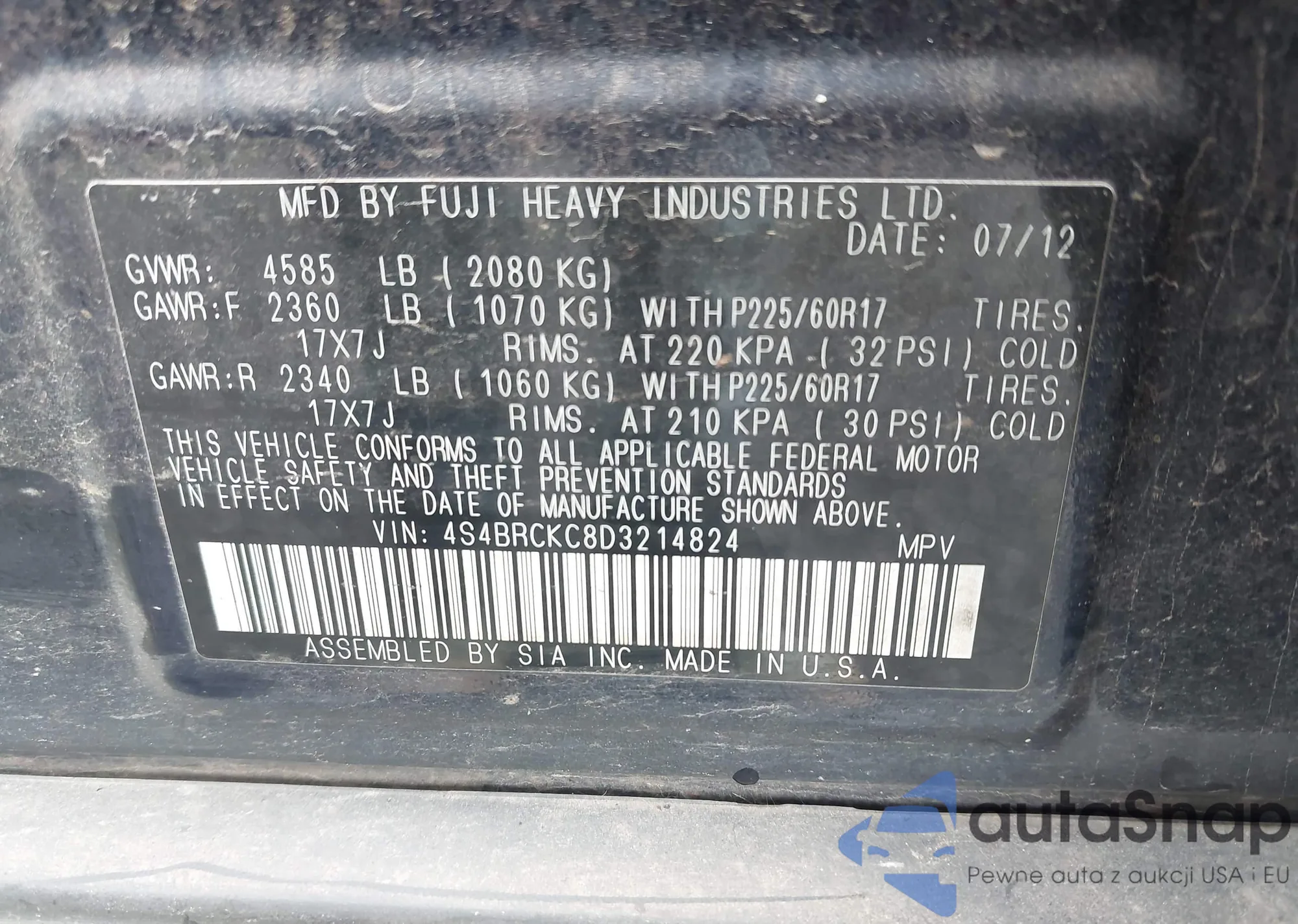 The car Subaru Outback 2013 (VIN 4S4BRCKC8D3214824) has not been auctioned before. The documents are clean, and the mileage matches or is below the market average. Sold by an insurance company – we recommend purchase. Delivery to the port will take approx. 6–8 weeks.