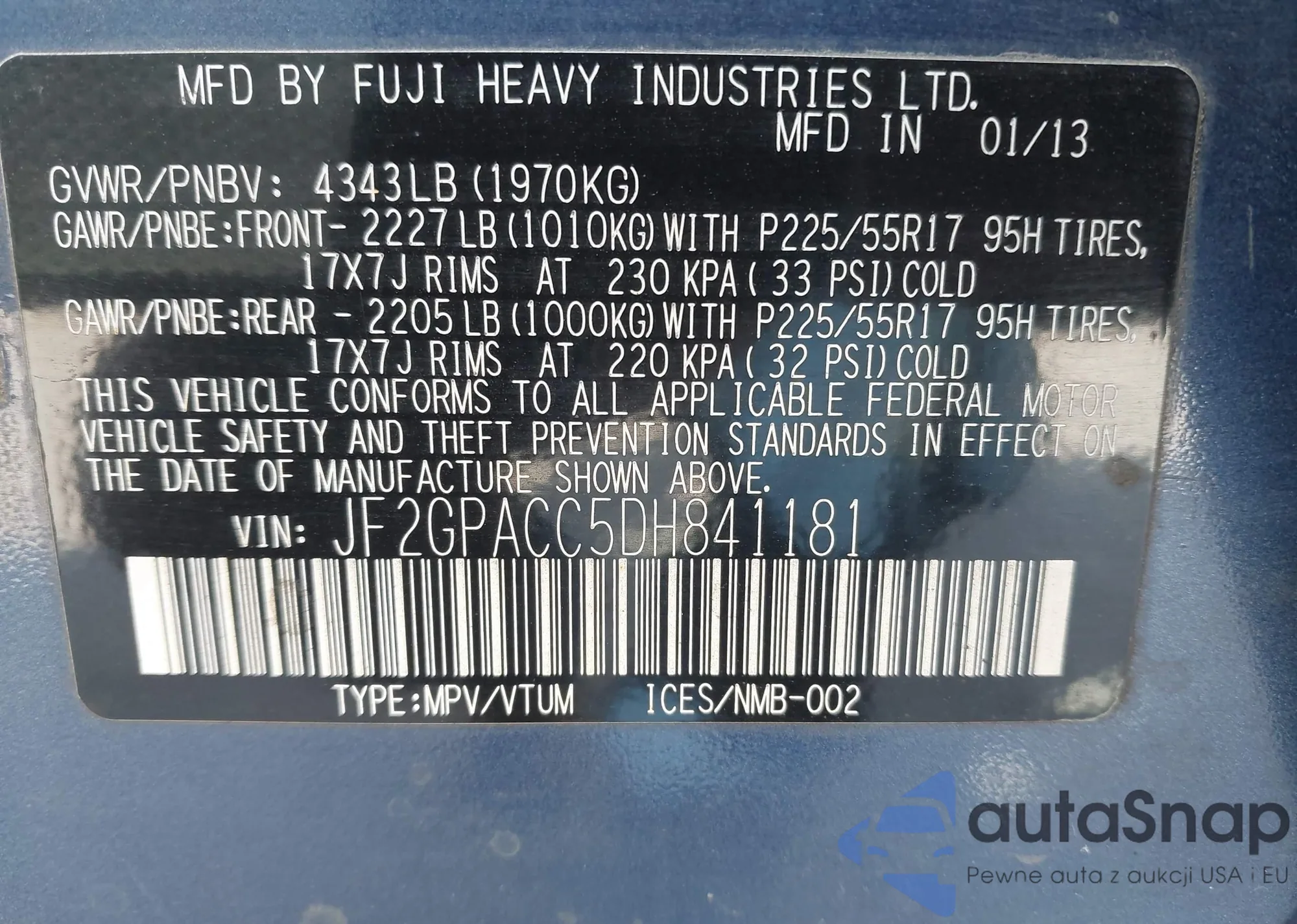 VIN: JF2GPACC5DH841181