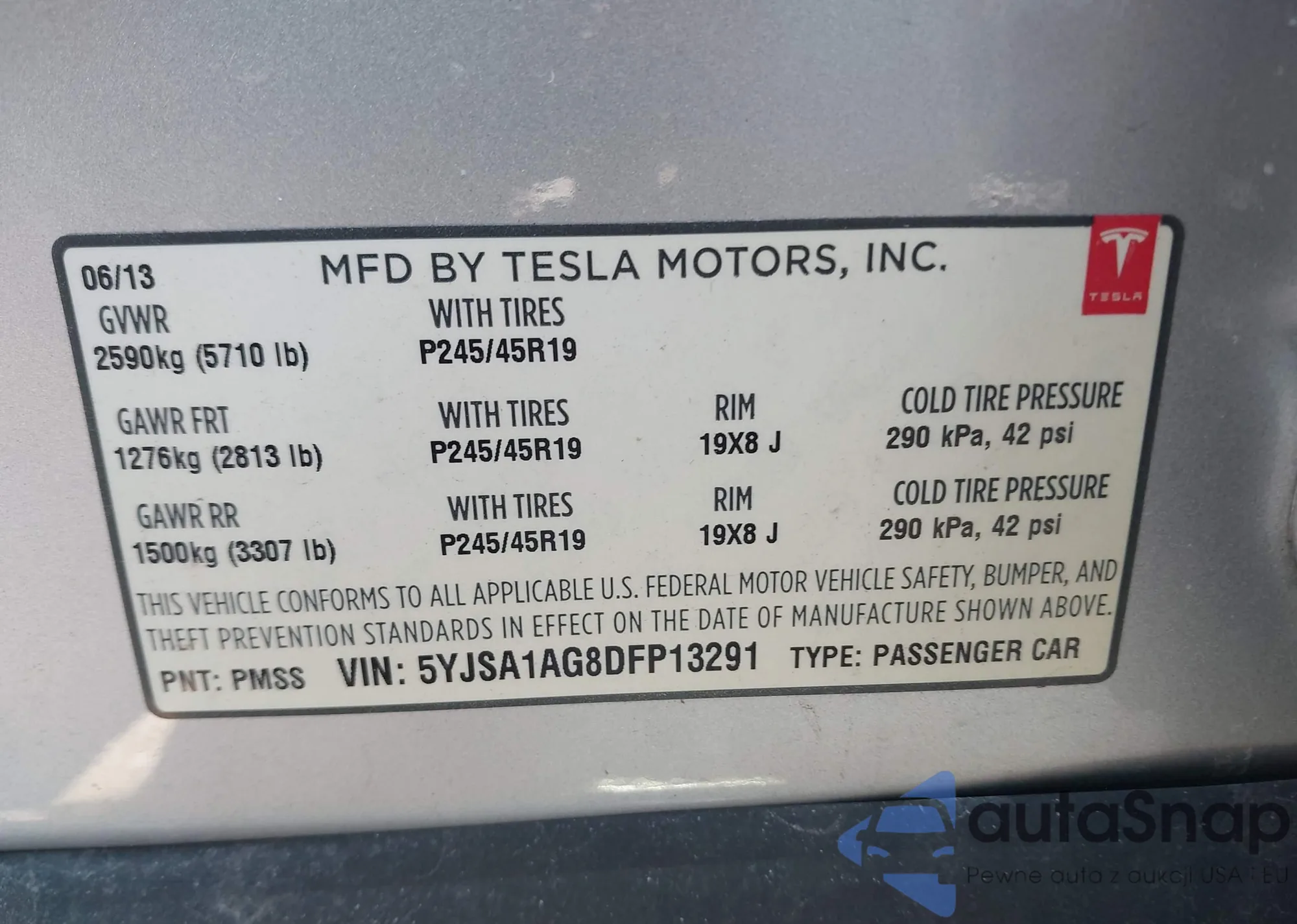 • VIN: 5YJSA1AG8DFP13291