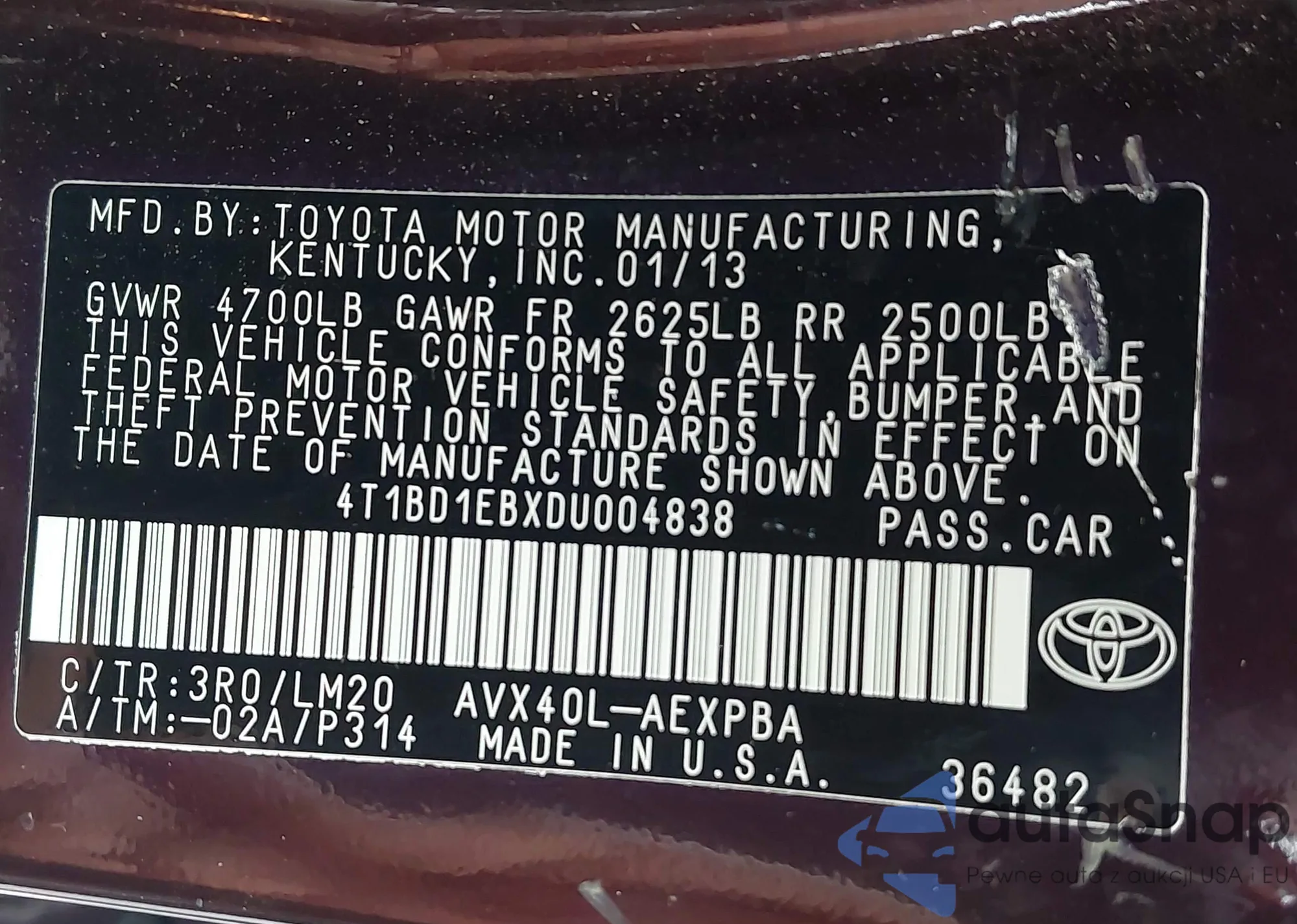 VIN: 4T1BD1EBXDU004838