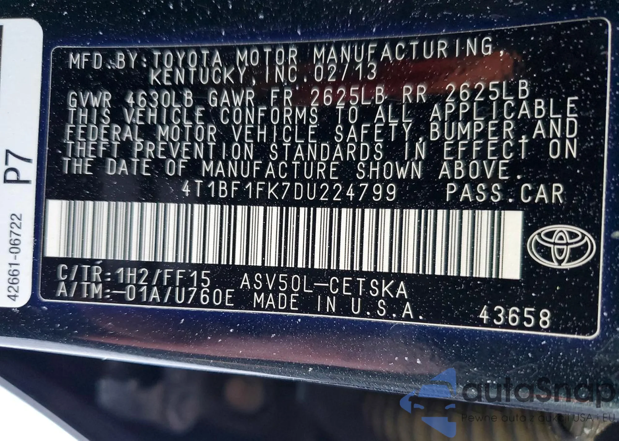 The car Toyota Camry 2013 (VIN 4T1BF1FK7DU224799) has not been auctioned before. The documents are clean, and the mileage matches or is below the market average. Sold by an insurance company – we recommend purchase. Delivery to the port will take approx. 6–8 weeks.