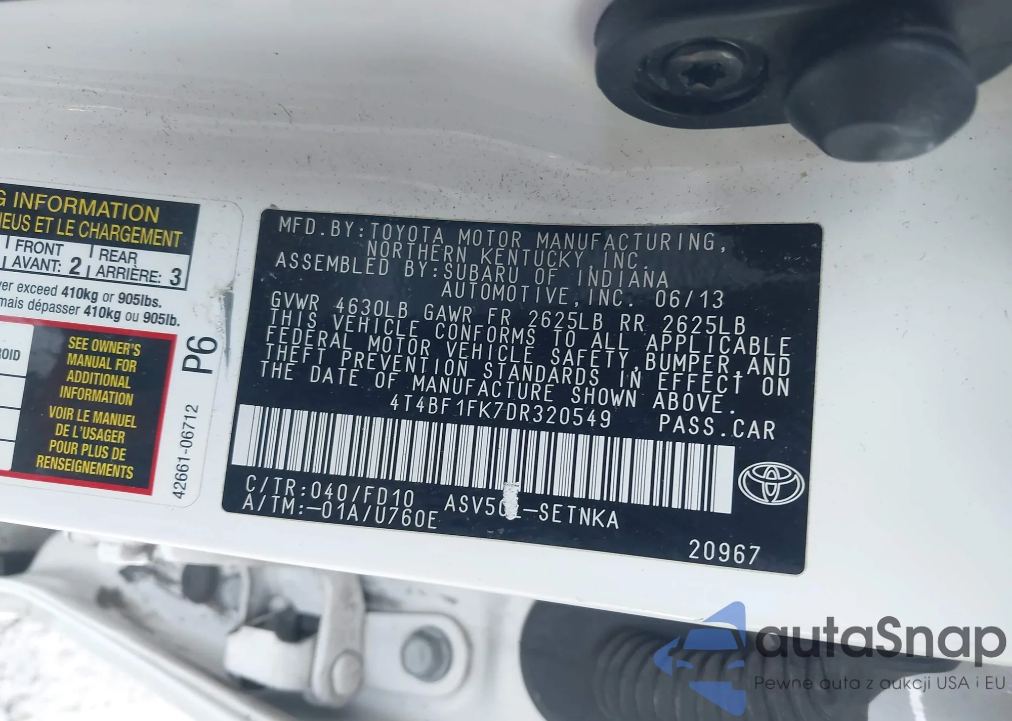 The car Toyota Camry 2013 (VIN 4T4BF1FK7DR320549) has not been auctioned before. The documents are clean, and the mileage matches or is below the market average. Sold by an insurance company – we recommend purchase. Delivery to the port will take approx. 6–8 weeks.