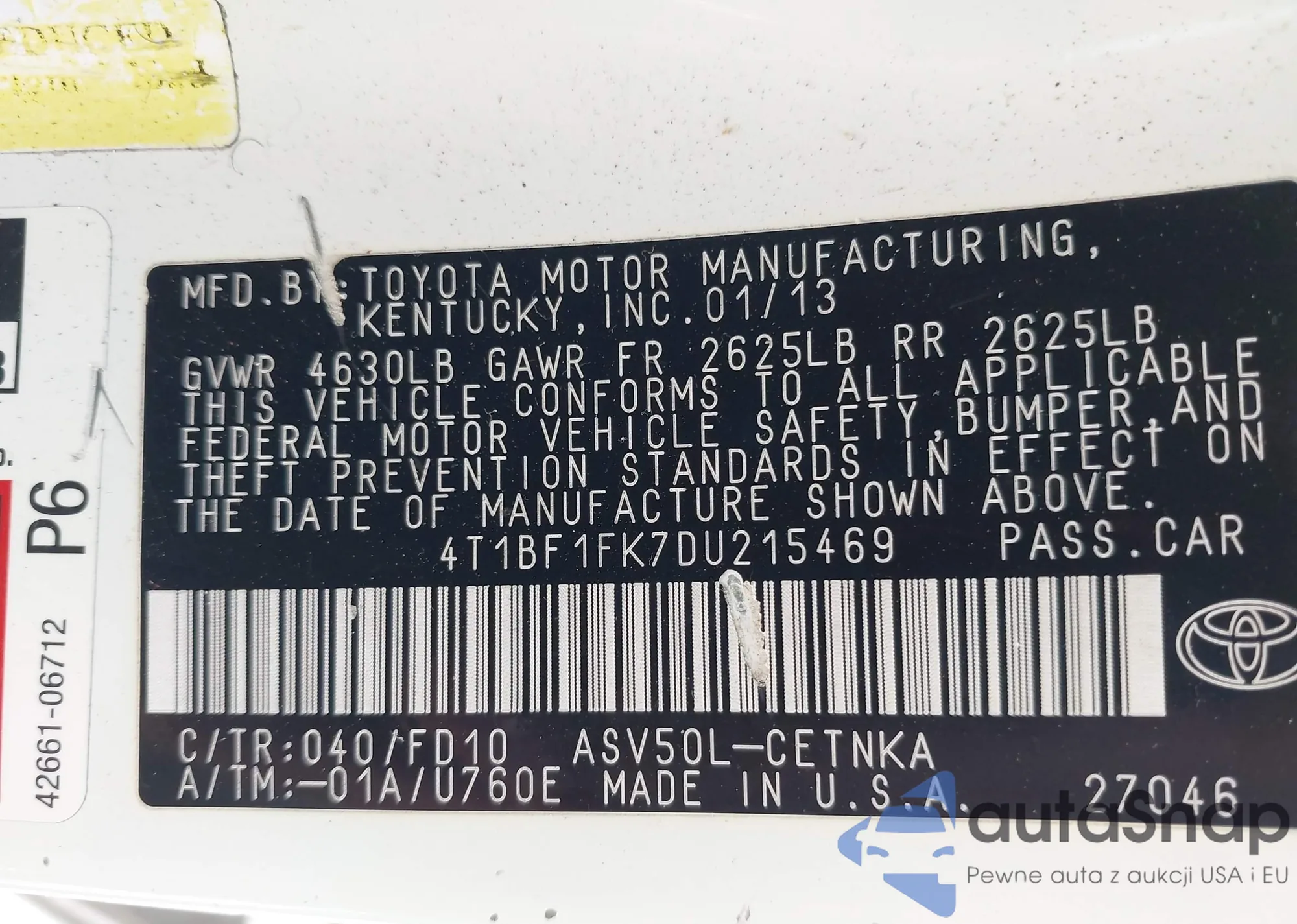 The car Toyota Camry 2013 (VIN 4T1BF1FK7DU215469) has not been auctioned before. The documents are clean, and the mileage matches or is below the market average. Sold by an insurance company – we recommend purchase. Delivery to the port will take approx. 6–8 weeks.