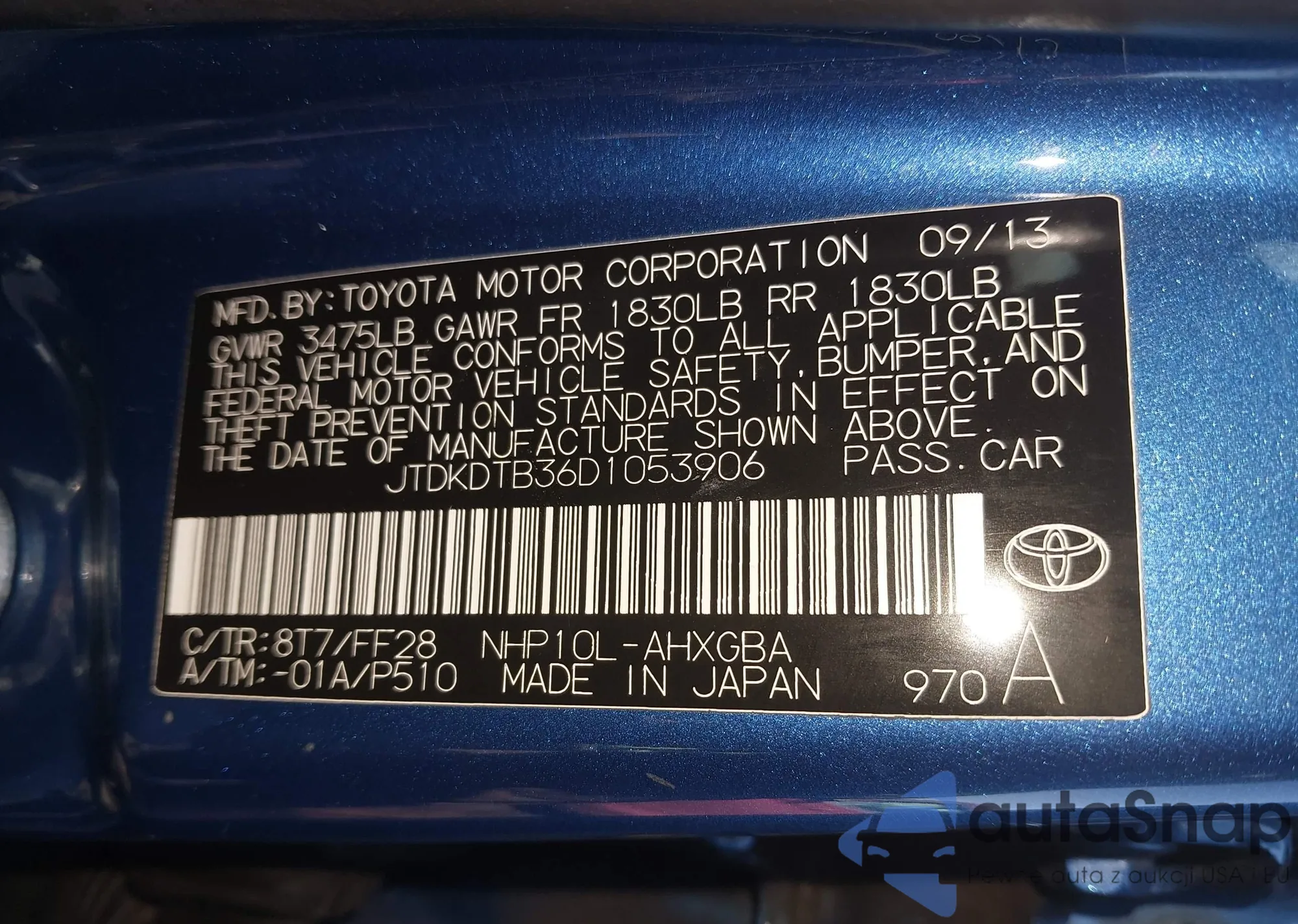 • VIN: JTDKDTB36D1053906