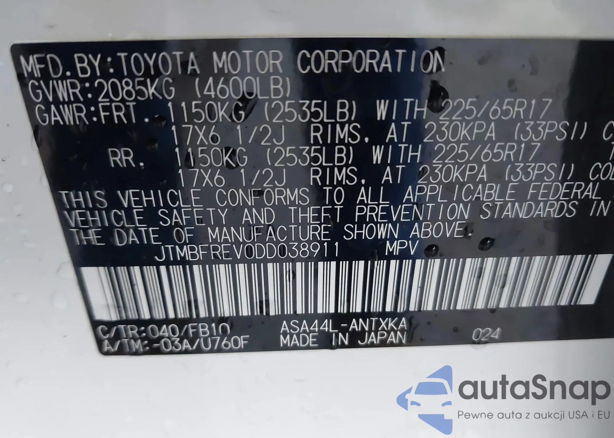 VIN: JTMBFREV0DD038911