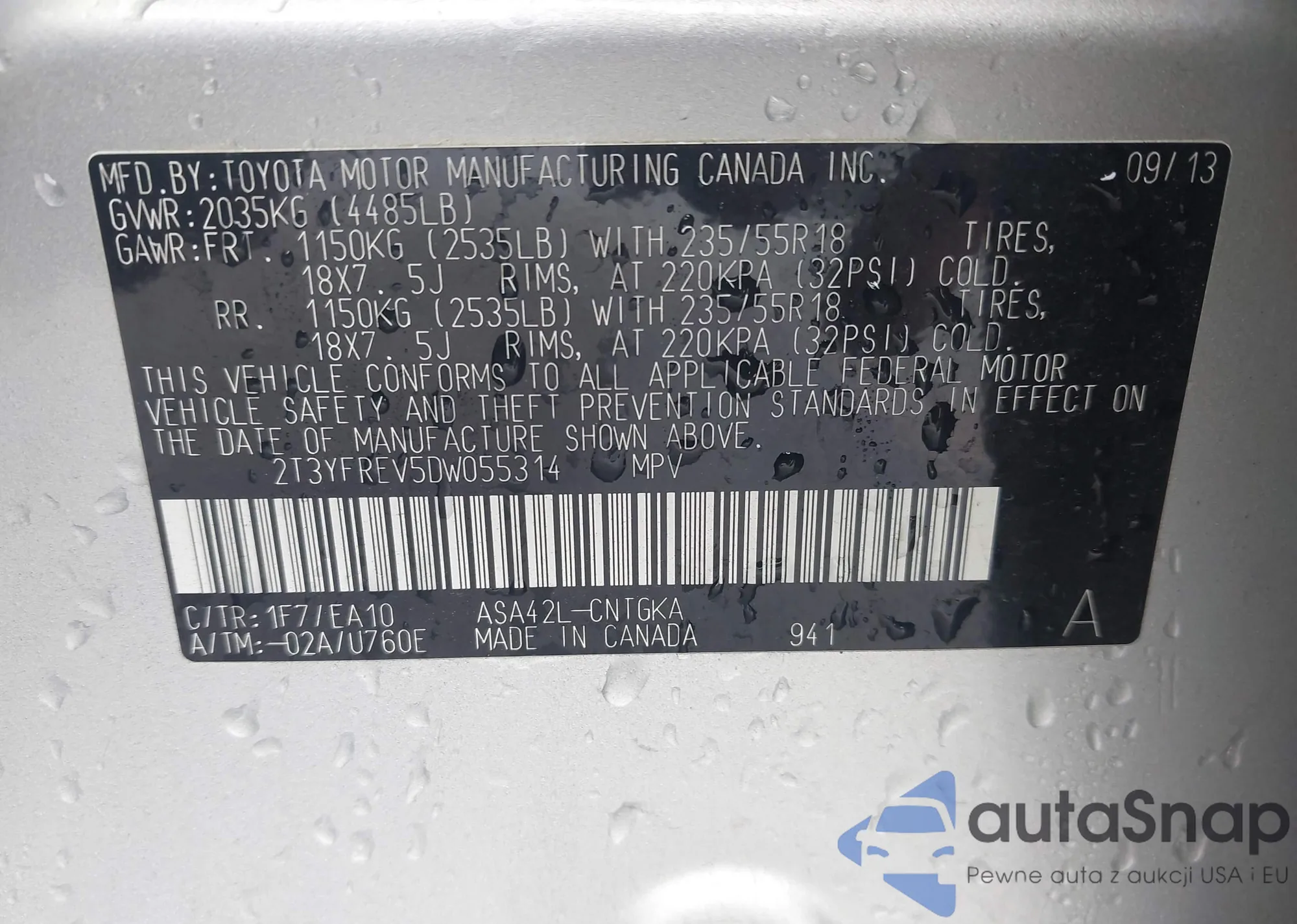 The car Toyota RAV 4 2013 (VIN 2T3YFREV5DW055314) has not been auctioned before. The documents are clean, and the mileage matches or is below the market average. Sold by an insurance company – we recommend purchase. Delivery to the port will take approx. 6–8 weeks.