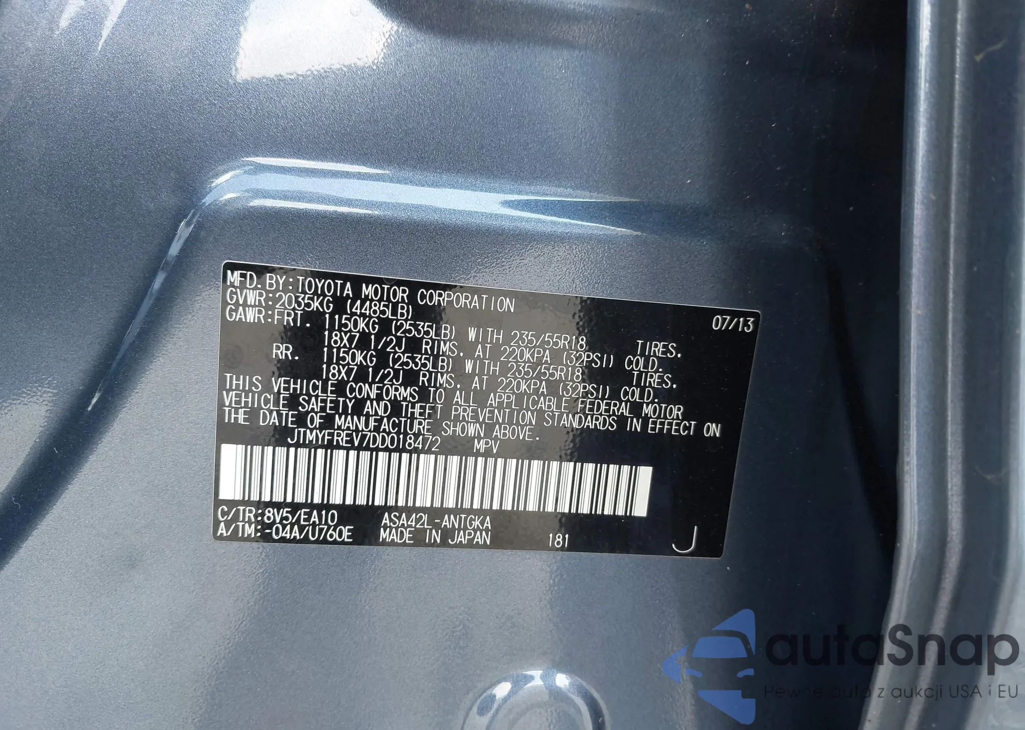 The car Toyota RAV 4 2013 (VIN JTMYFREV7DD018472) has not been auctioned before. The documents are clean, and the mileage matches or is below the market average. Sold by an insurance company – we recommend purchase. Delivery to the port will take approx. 6–8 weeks.