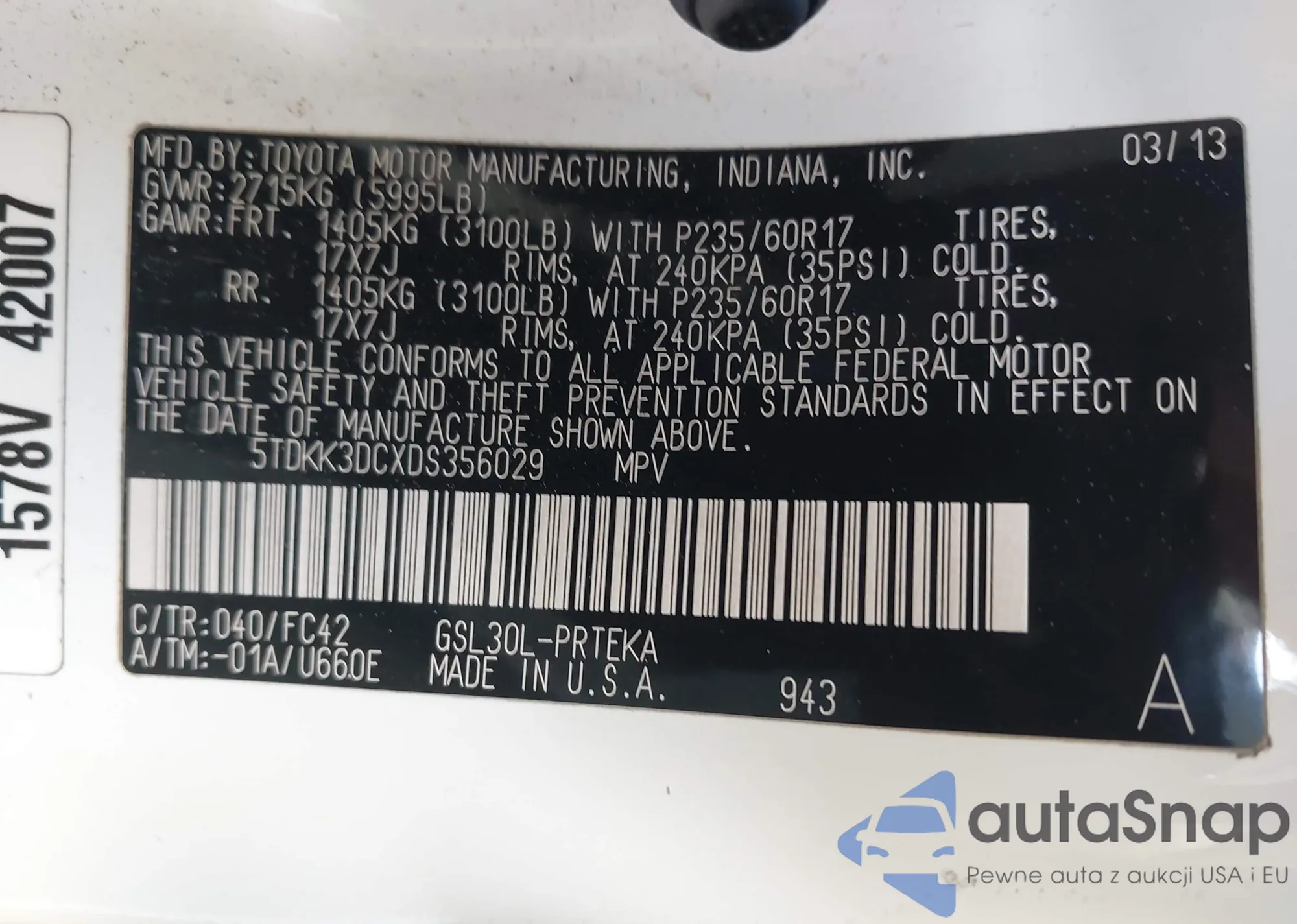 The car Toyota Sienna 2013 (VIN 5TDKK3DCXDS356029) has not been auctioned before. The documents are clean, and the mileage matches or is below the market average. Sold by an insurance company – we recommend purchase. Delivery to the port will take approx. 6–8 weeks.