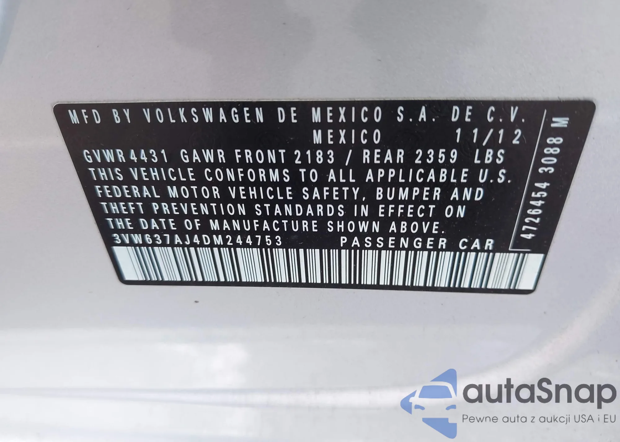 The car Volkswagen Jetta 2013 (VIN 3VW637AJ4DM244753) has not been auctioned before. The documents are clean, and the mileage matches or is below the market average. Sold by an insurance company – we recommend purchase. Delivery to the port will take approx. 6–8 weeks.