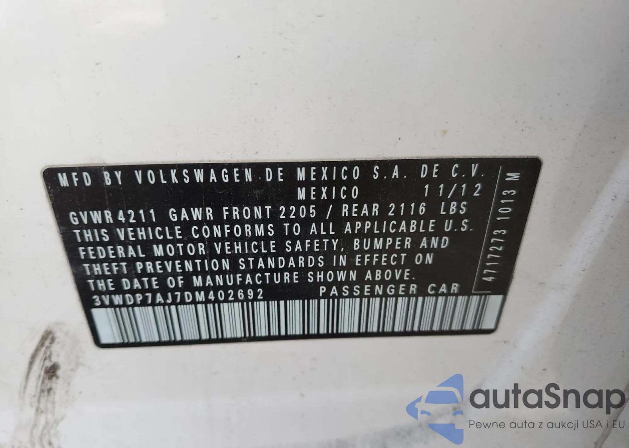 VIN: 3VWDP7AJ7DM402692