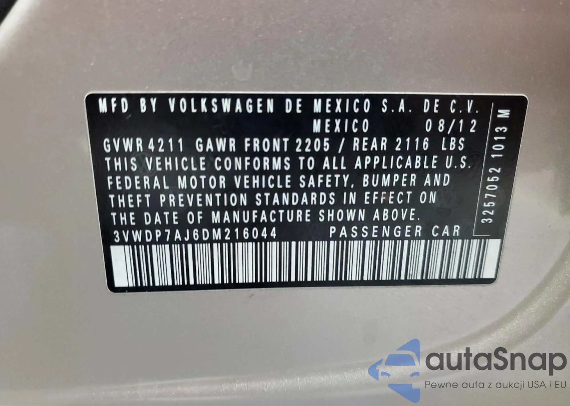 VIN: 3VWDP7AJ6DM216044