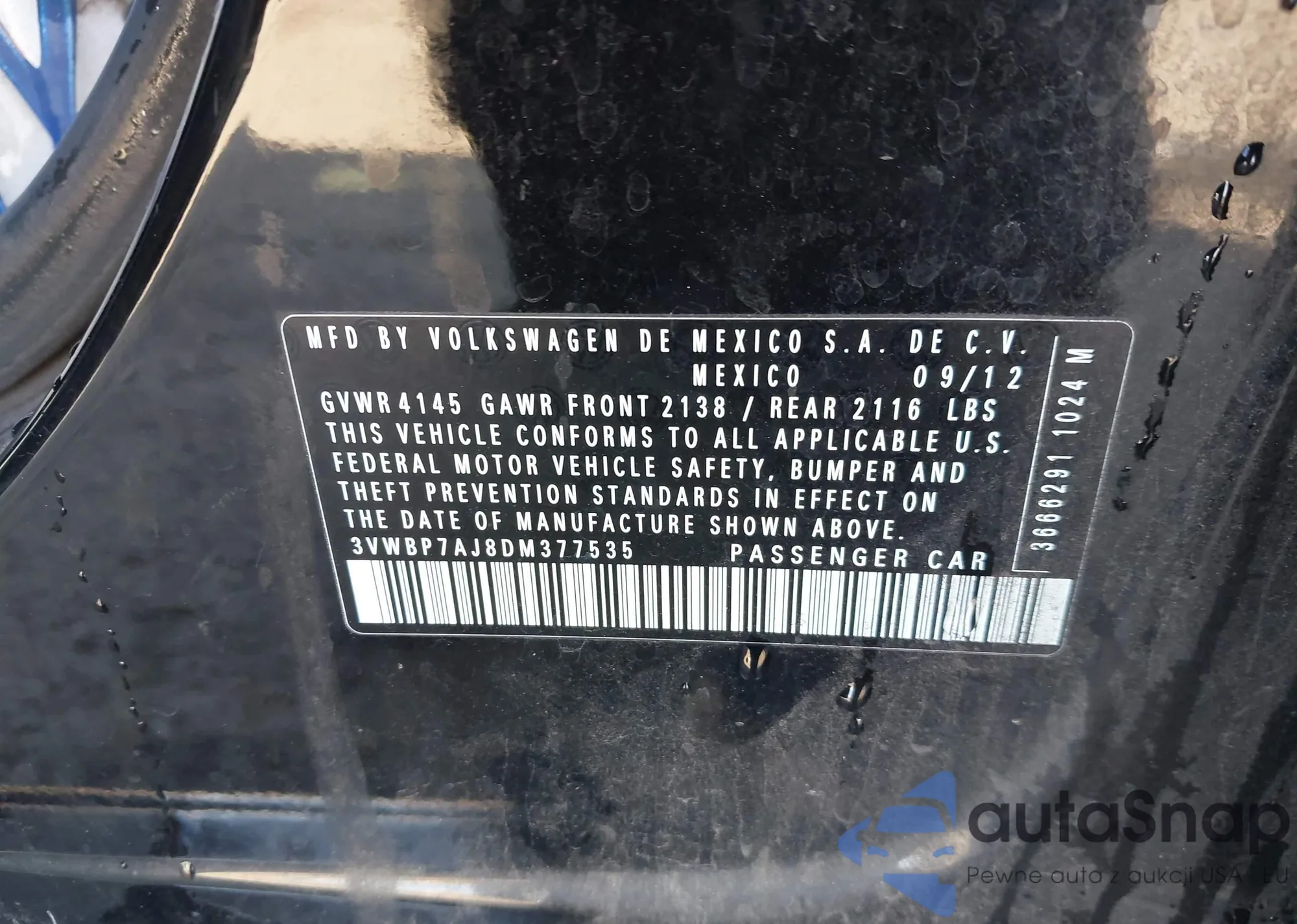The car Volkswagen Jetta 2013 (VIN 3VWBP7AJ8DM377535) has not been auctioned before. The documents are clean, and the mileage matches or is below the market average. Sold by an insurance company – we recommend purchase. Delivery to the port will take approx. 6–8 weeks.