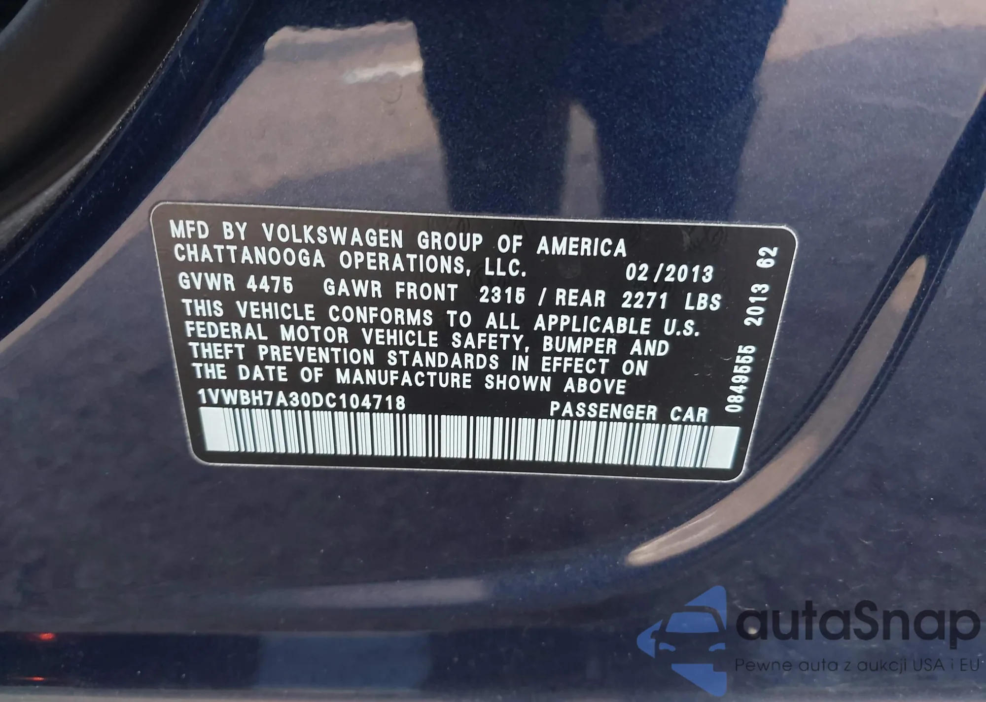• VIN: 1VWBH7A30DC104718