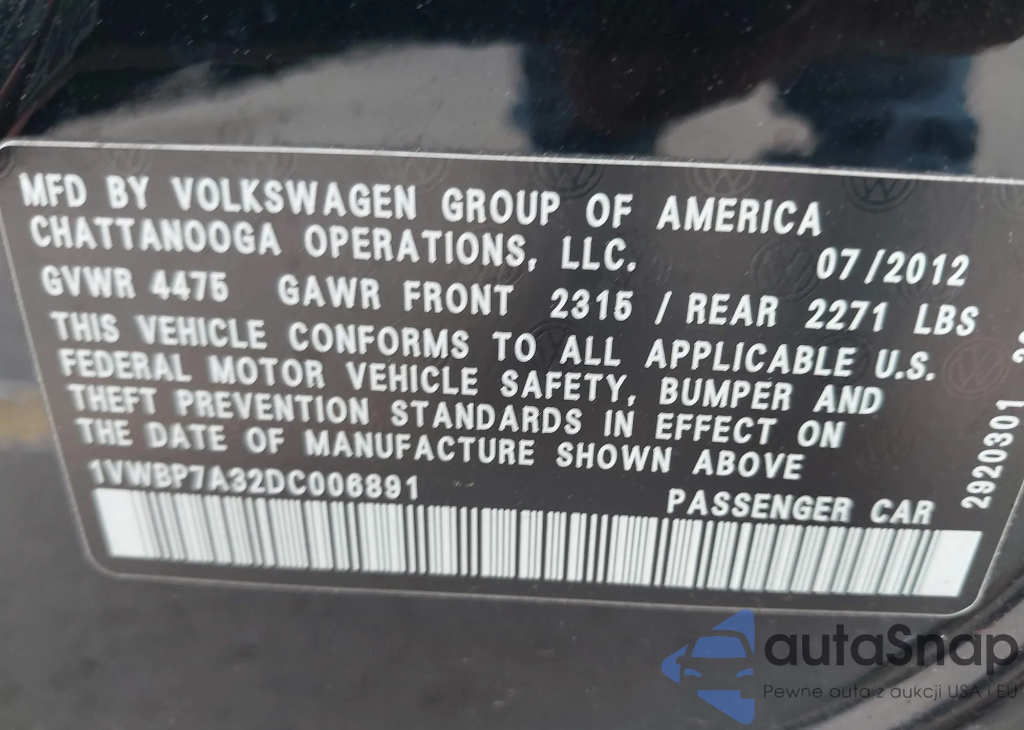 VIN: 1VWBP7A32DC006891