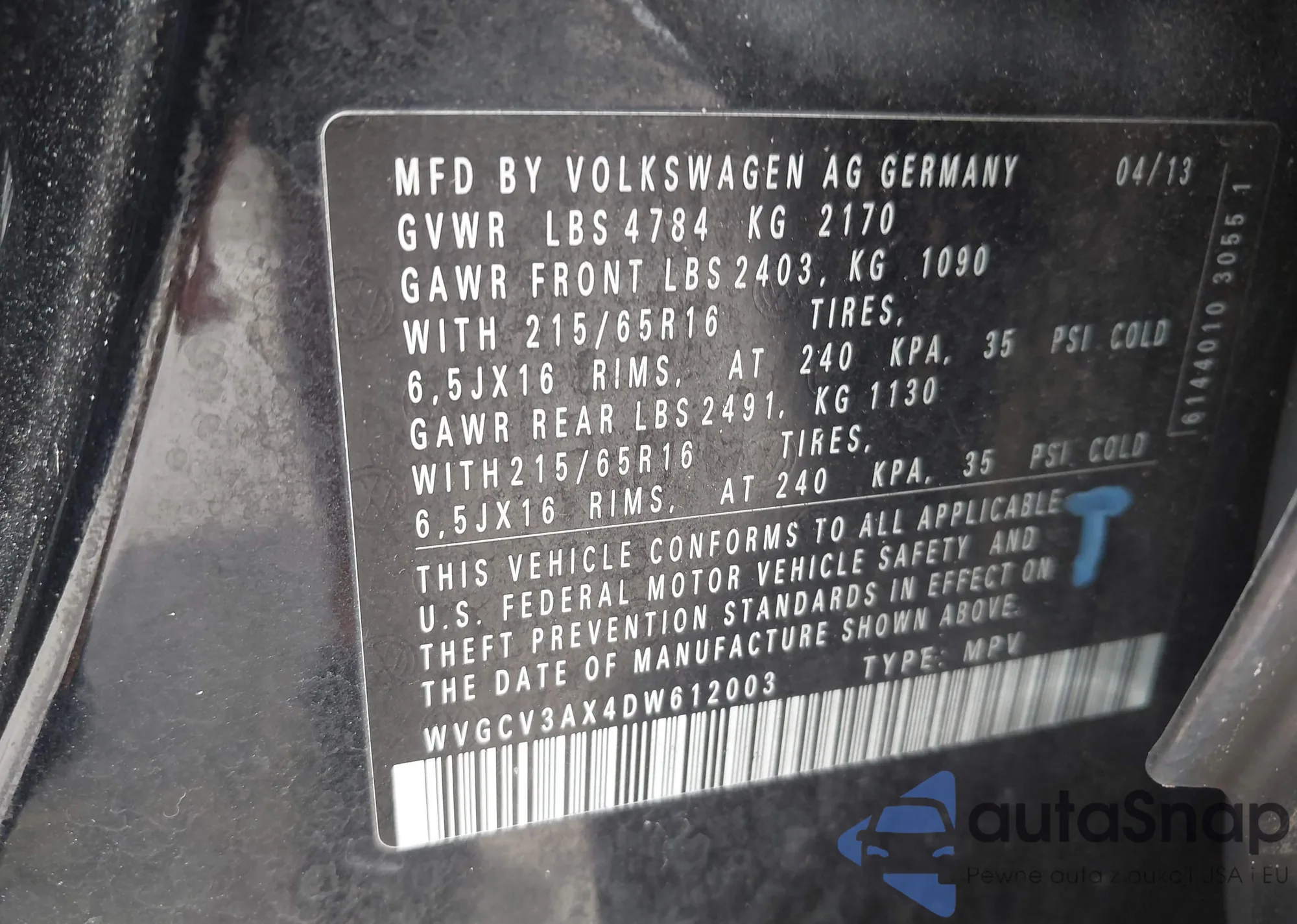 VIN: WVGCV3AX4DW612003