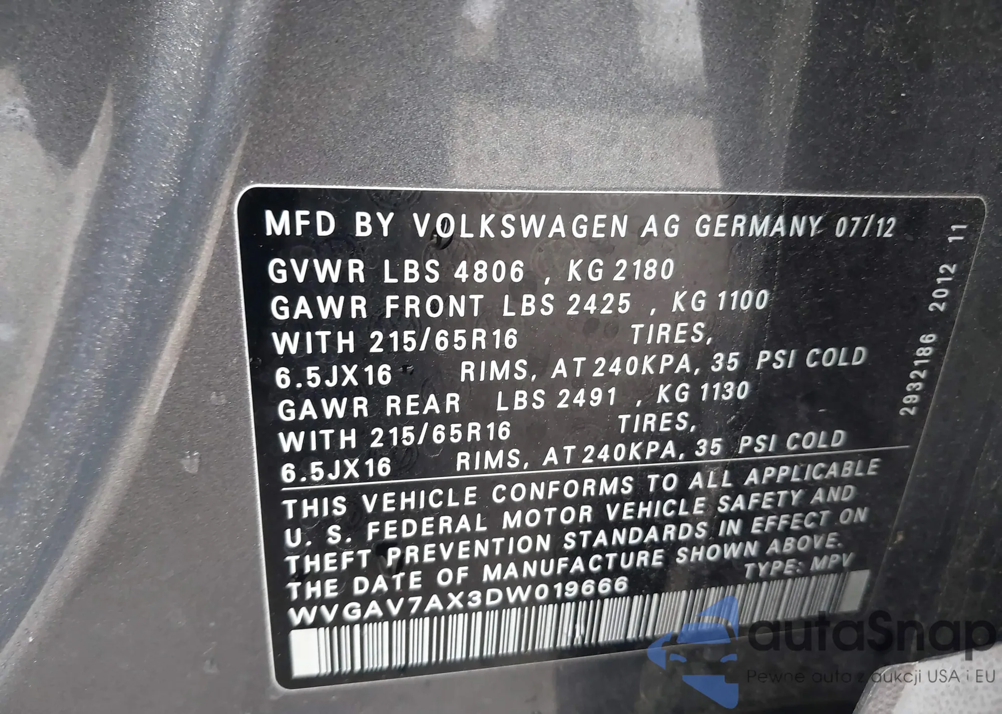 VIN: WVGAV7AX3DW019666