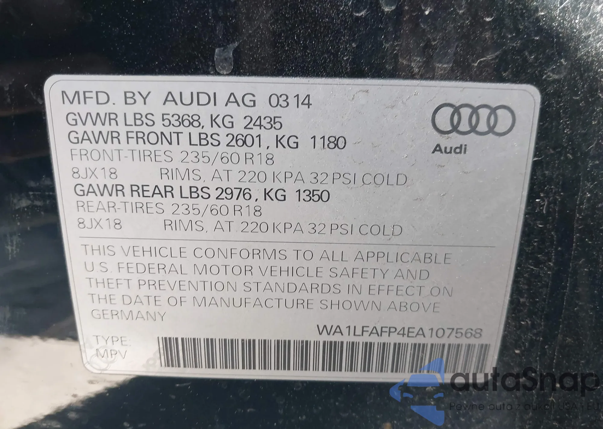 The car Audi Q5 2014 (VIN WA1LFAFP4EA107568) has not been auctioned before. The documents are clean, and the mileage matches or is below the market average. Sold by an insurance company – we recommend purchase. Delivery to the port will take approx. 6–8 weeks.