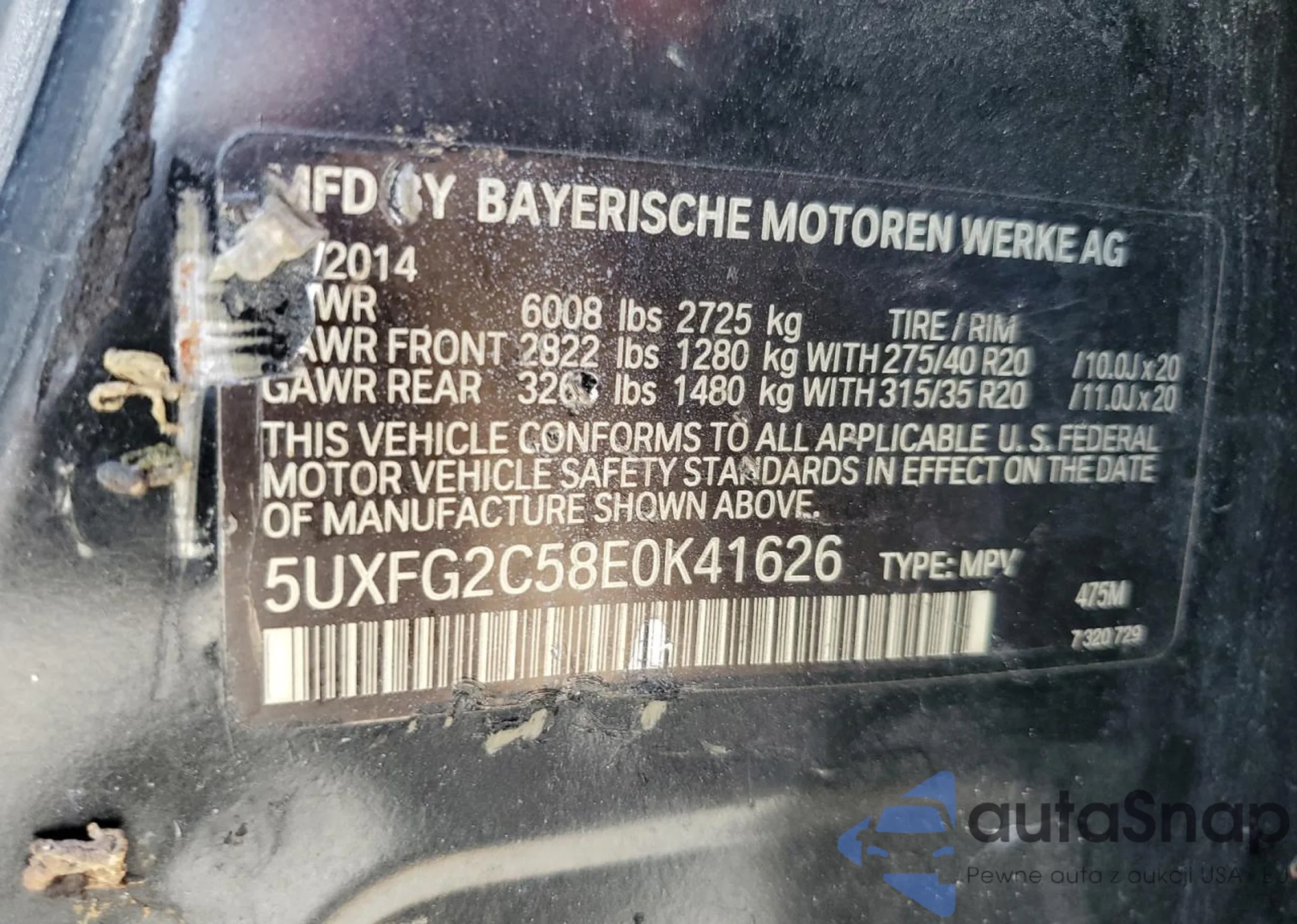 The car BMW X6 2014 (VIN 5UXFG2C58E0K41626) has documents that prevent registration. Export and registration may be difficult. Contact AutaSnap experts to find alternatives.
