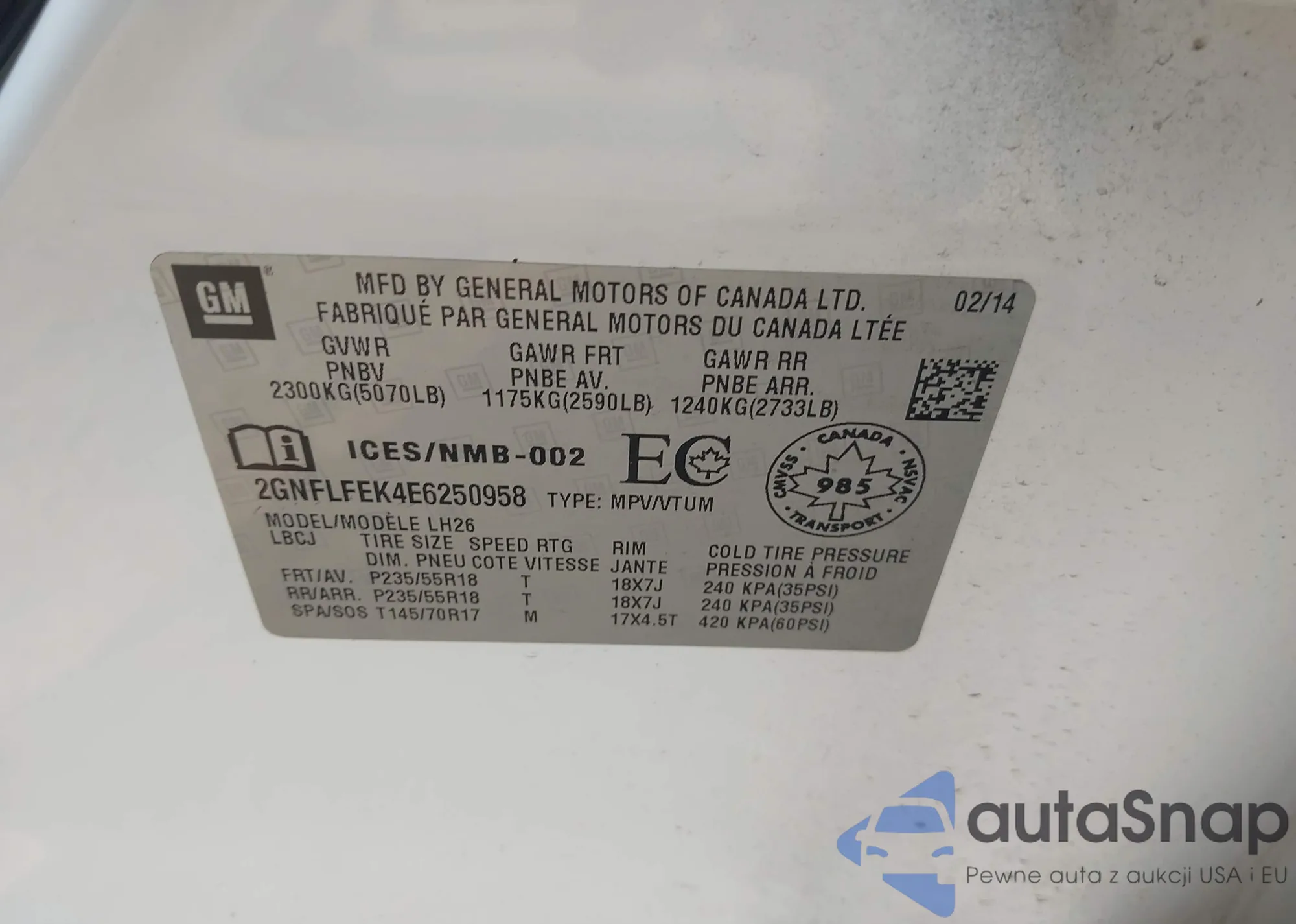 VIN: 2GNFLFEK4E6250958