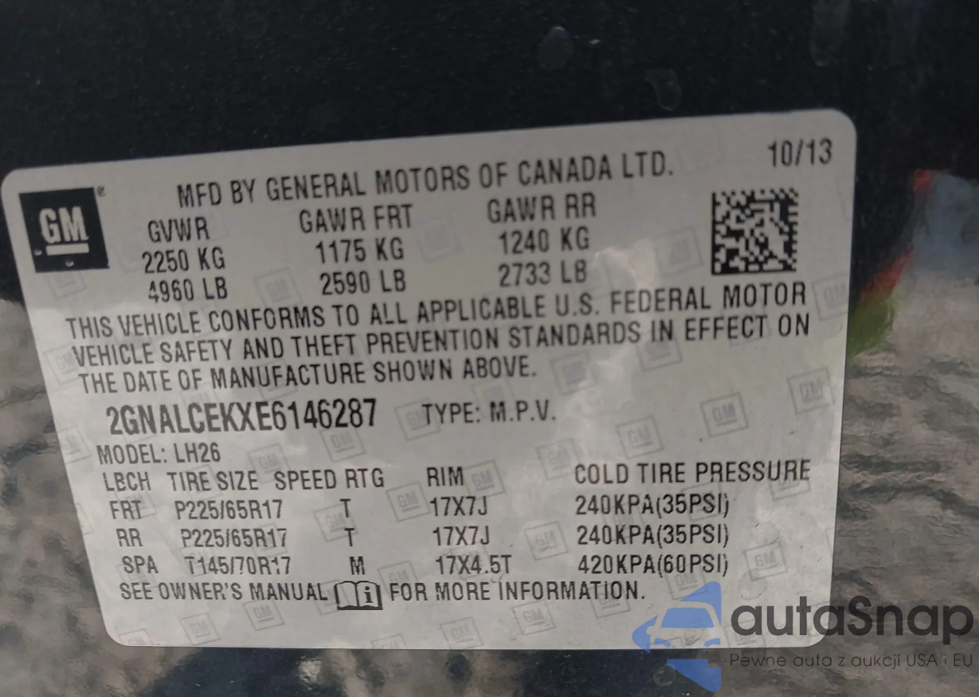 The car Chevrolet Equinox 2014 (VIN 2GNALCEKXE6146287) has not been auctioned before. The documents are clean, and the mileage matches or is below the market average. Sold by an insurance company – we recommend purchase. Delivery to the port will take approx. 6–8 weeks.
