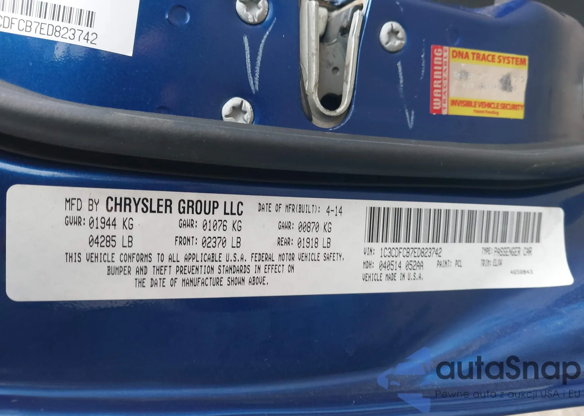 The car Dodge Dart 2014 (VIN 1C3CDFCB7ED823742) has not been auctioned before. The documents are clean, and the mileage matches or is below the market average. Sold by an insurance company – we recommend purchase. Delivery to the port will take approx. 6–8 weeks.