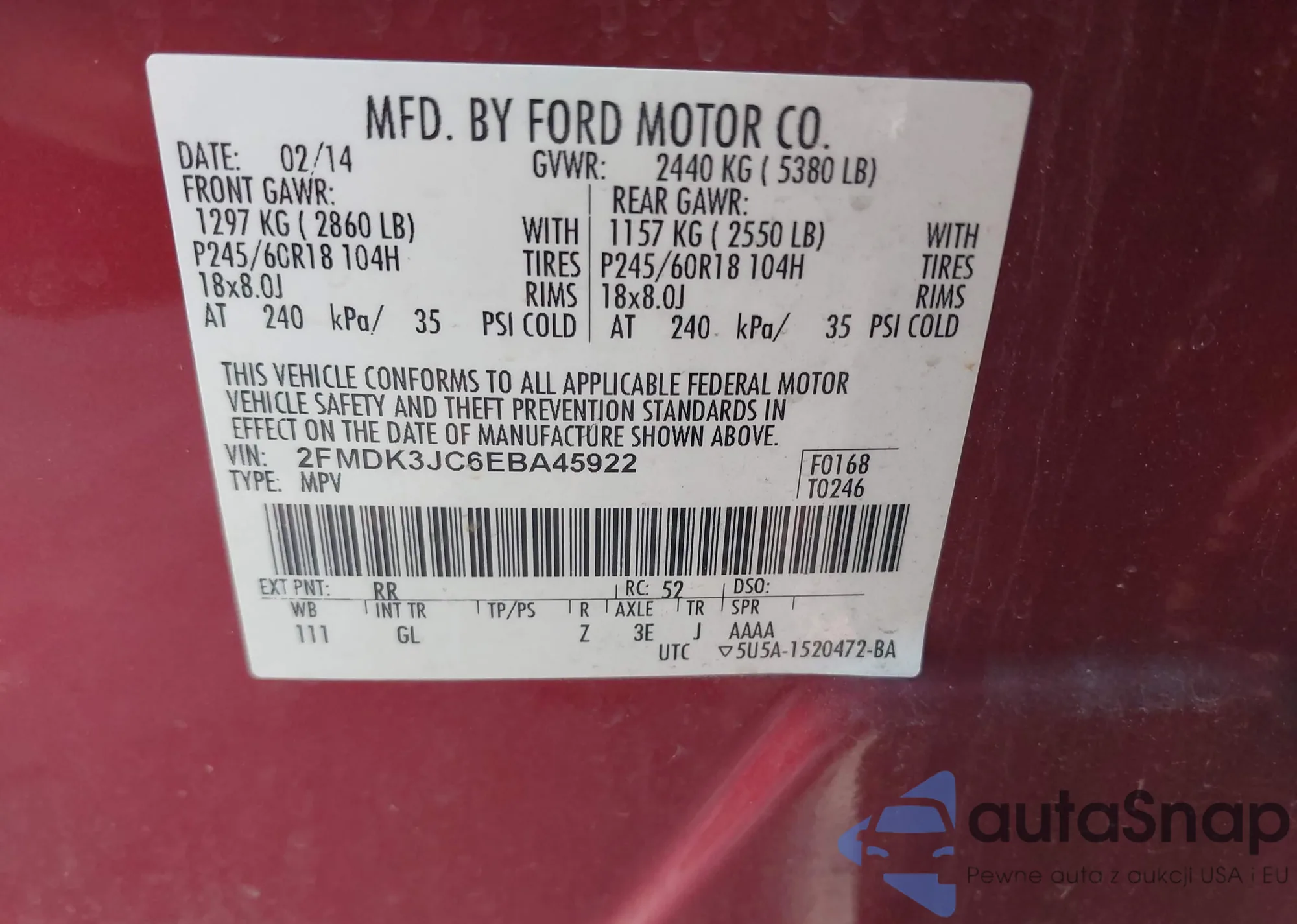 VIN: 2FMDK3JC6EBA45922