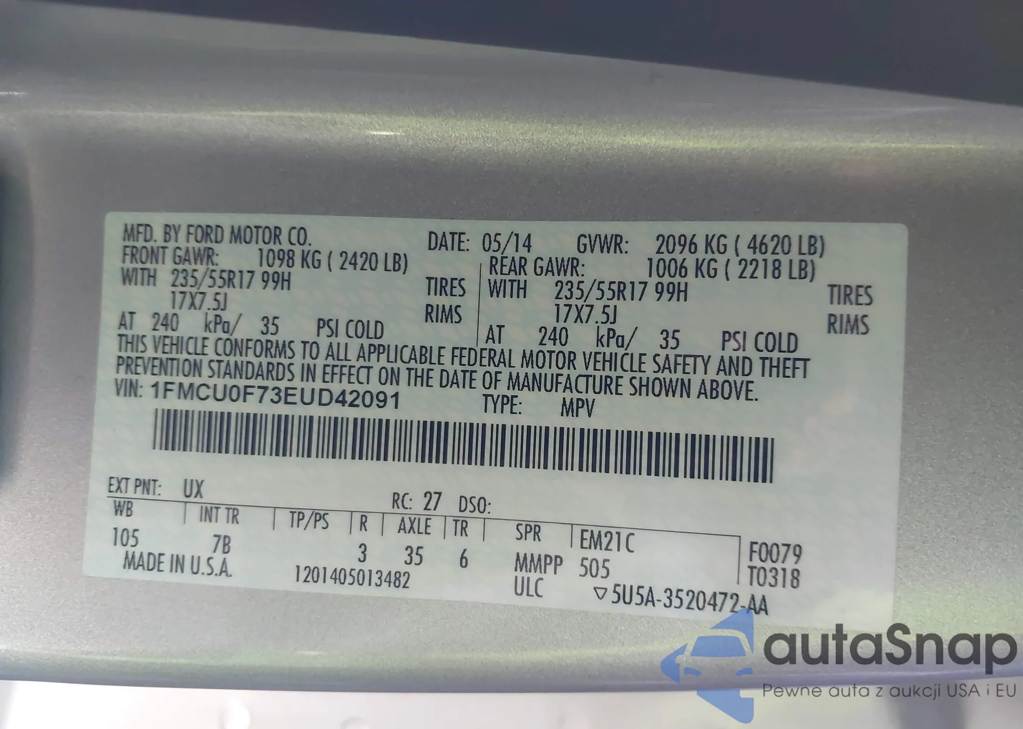 The car Ford Escape 2014 (VIN 1FMCU0F73EUD42091) has not been auctioned before. The documents are clean, and the mileage matches or is below the market average. Sold by an insurance company – we recommend purchase. Delivery to the port will take approx. 6–8 weeks.