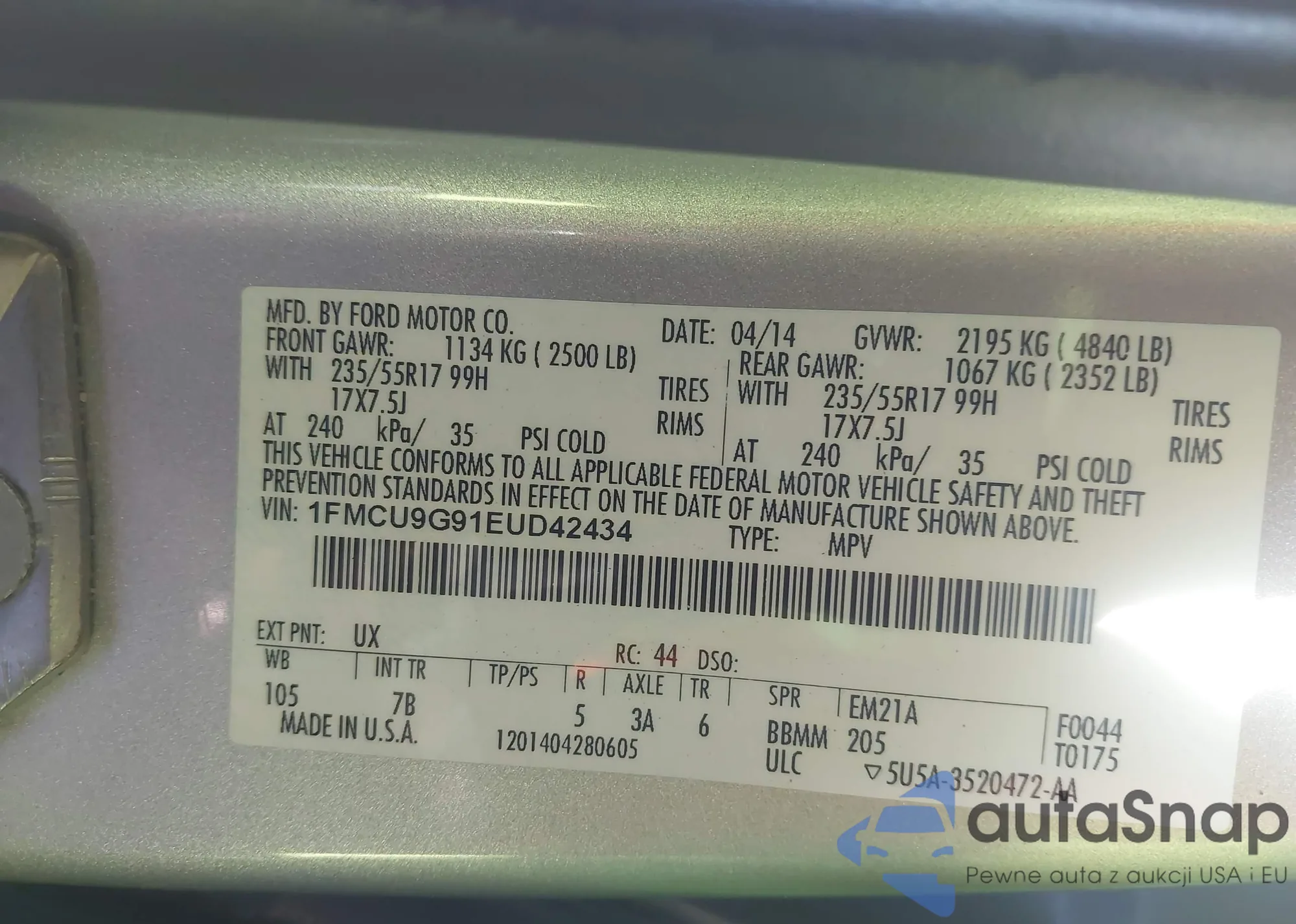 The car Ford Escape 2014 (VIN 1FMCU9G91EUD42434) has not been auctioned before. The documents are clean, and the mileage matches or is below the market average. Sold by an insurance company – we recommend purchase. Delivery to the port will take approx. 6–8 weeks.