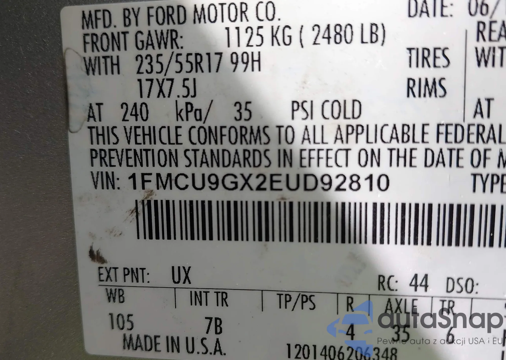 VIN: 1FMCU9GX2EUD92810