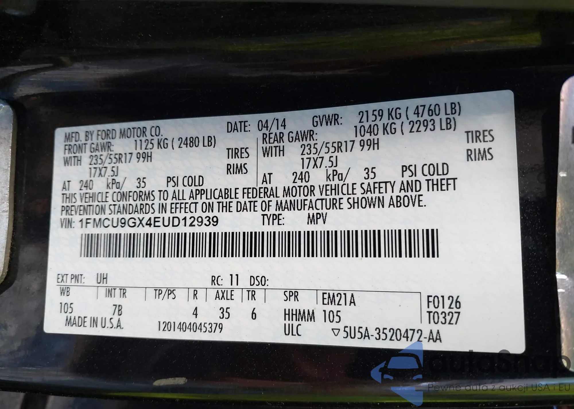 VIN: 1FMCU9GX4EUD12939