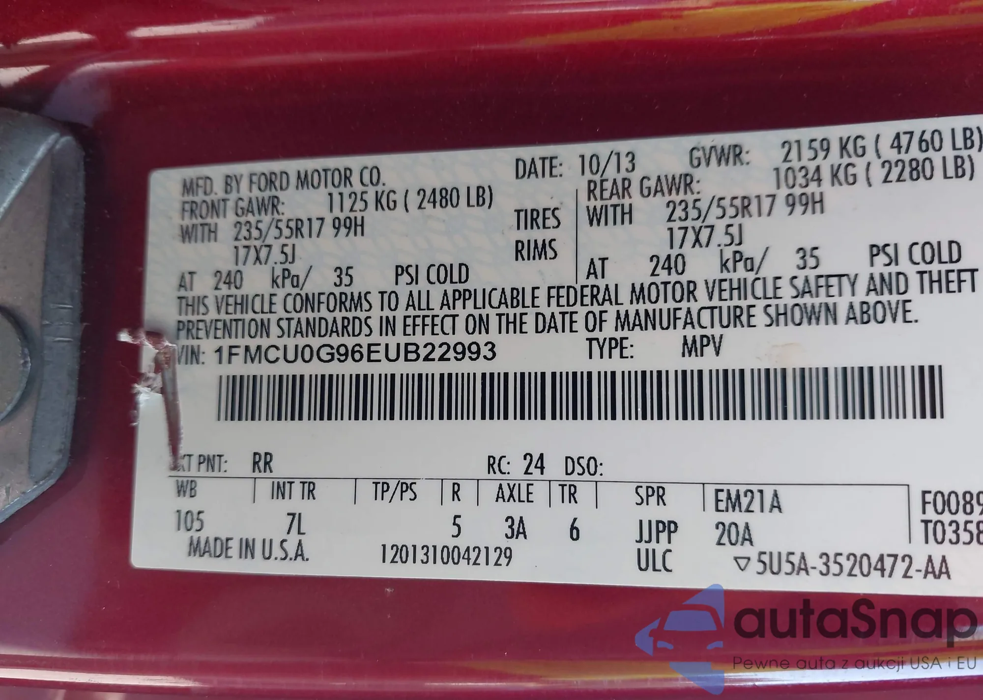 • VIN: 1FMCU0G96EUB22993