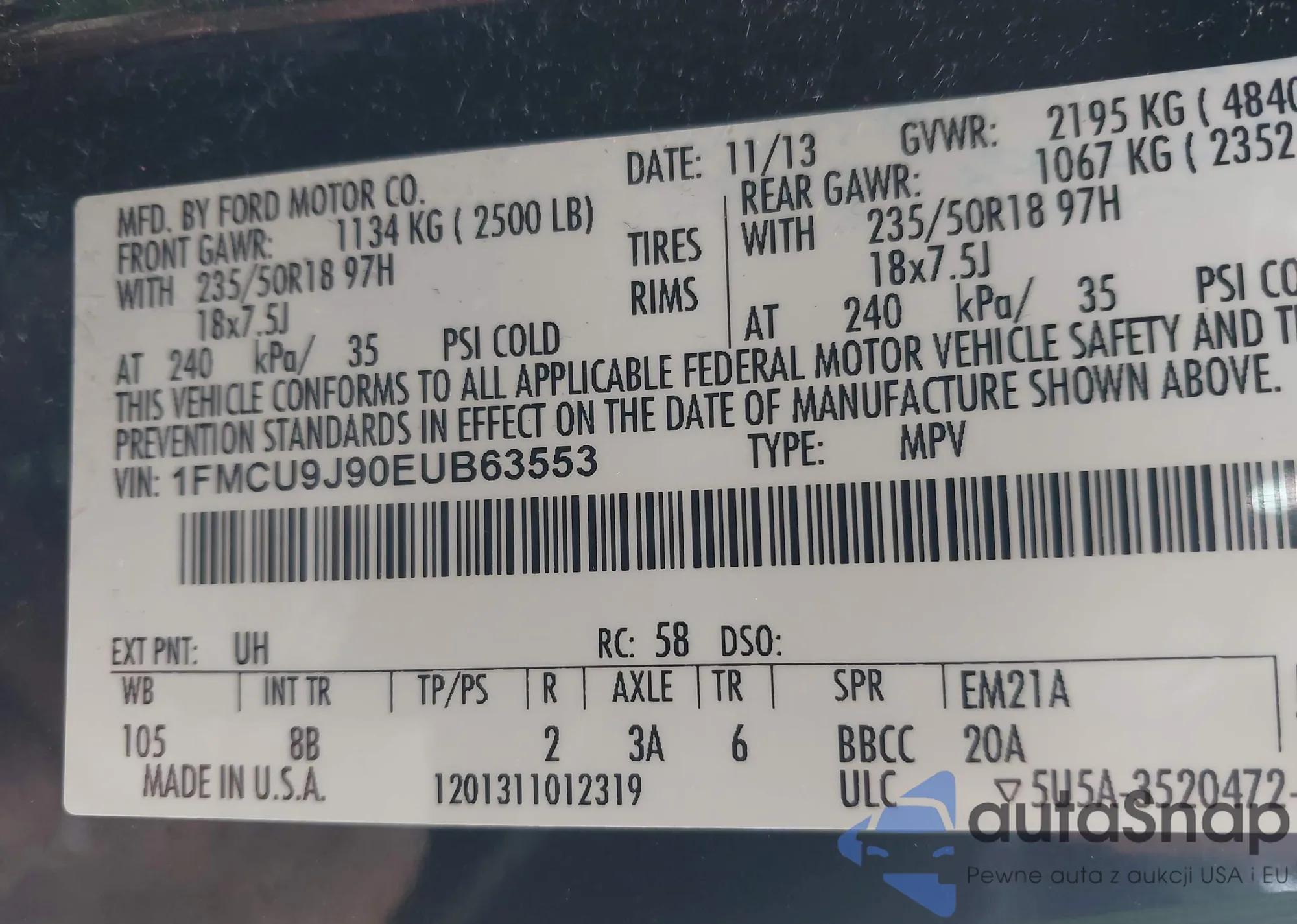 VIN: 1FMCU9J90EUB63553