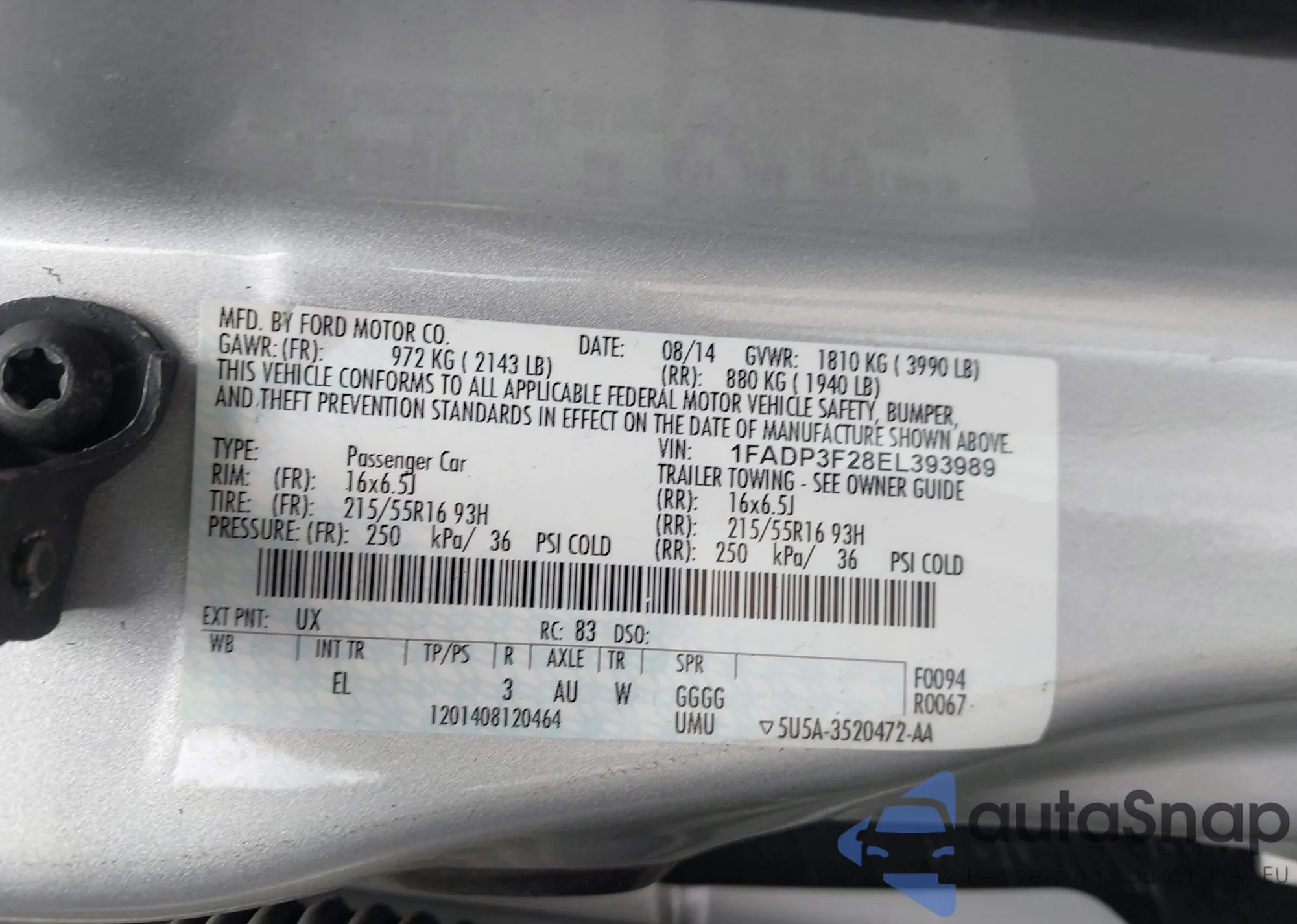 VIN: 1FADP3F28EL393989