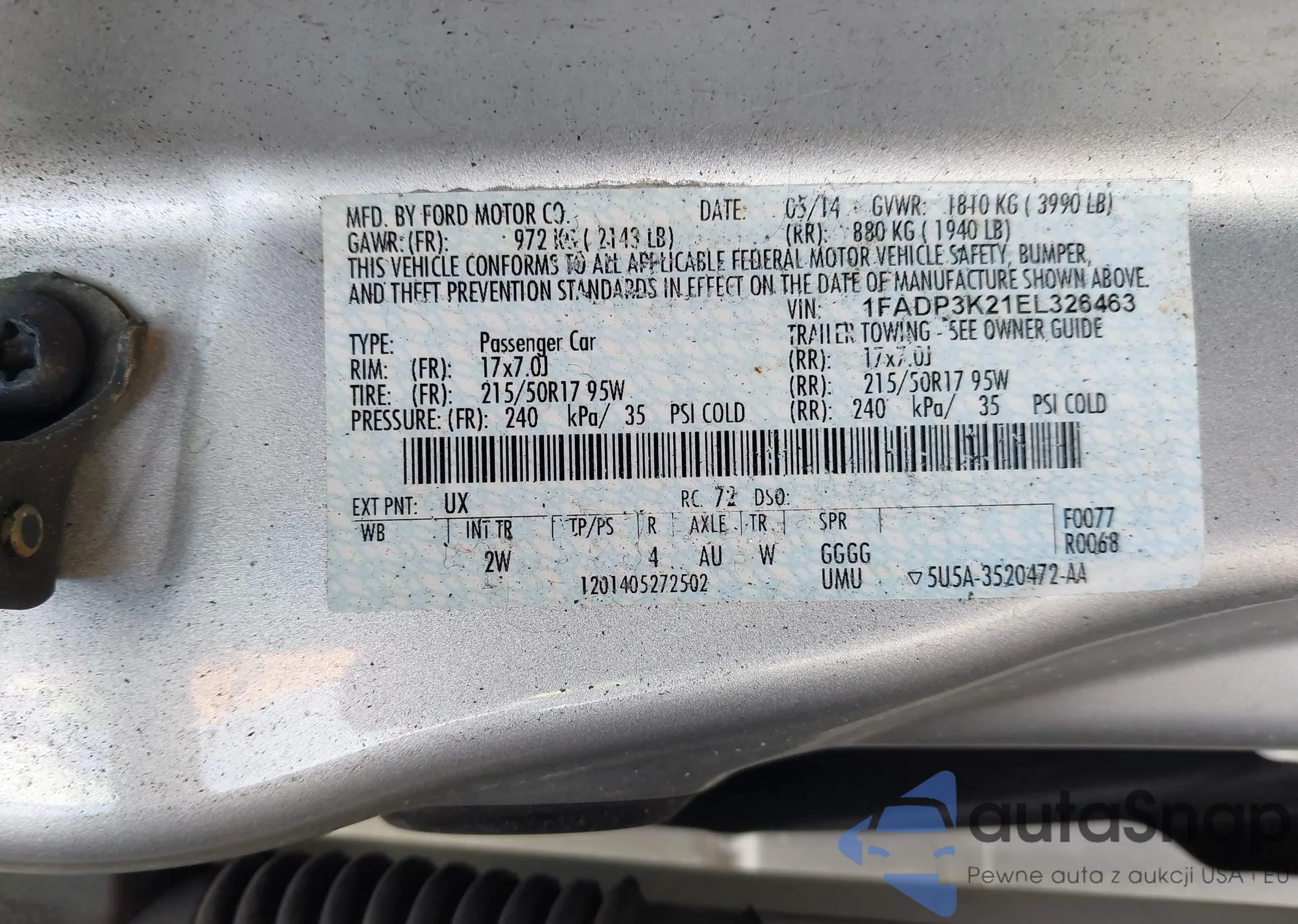 The car Ford Focus 2014 (VIN 1FADP3K21EL326463) has not been auctioned before. The documents are clean, and the mileage matches or is below the market average. Sold by an insurance company – we recommend purchase. Delivery to the port will take approx. 6–8 weeks.