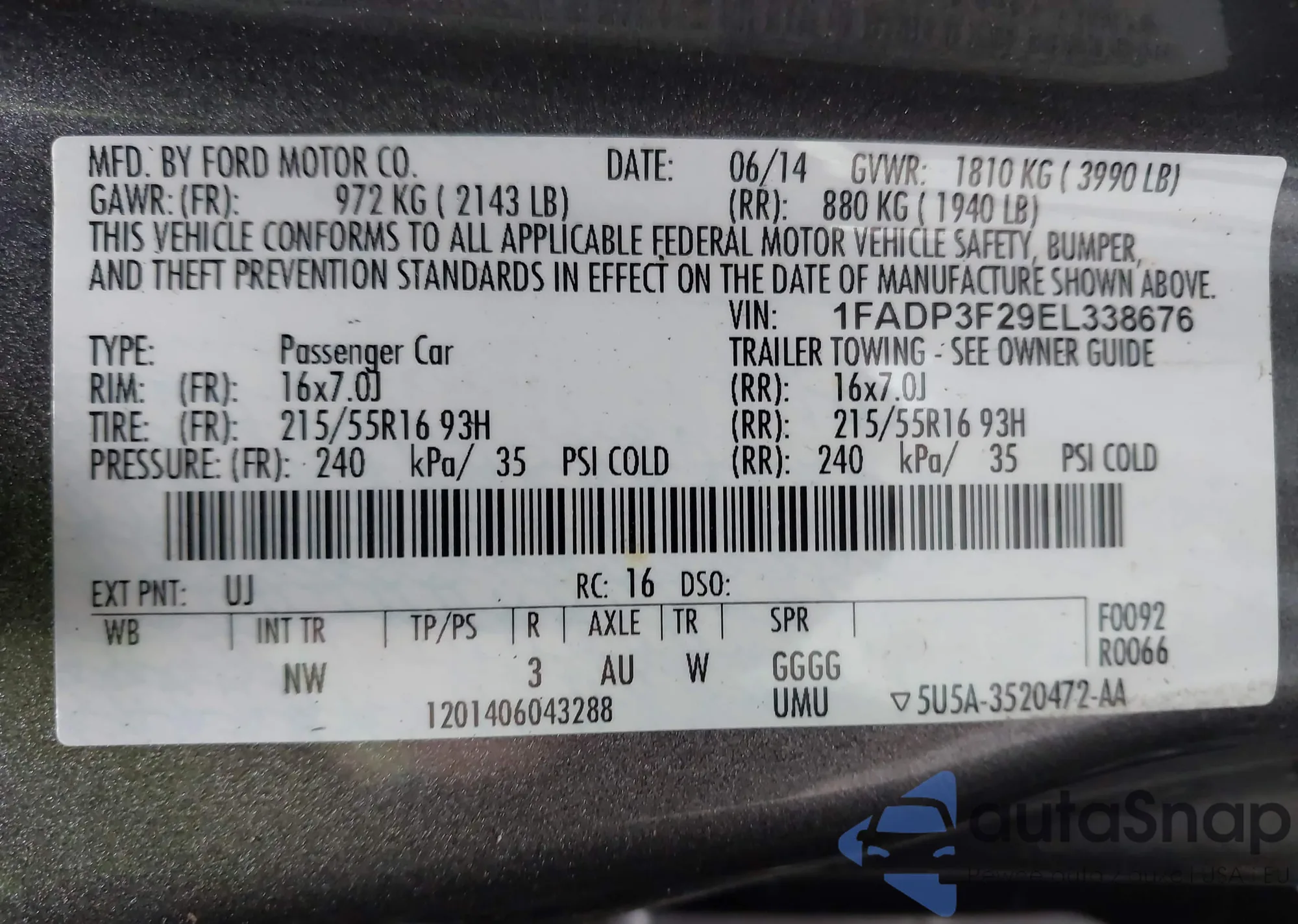 VIN: 1FADP3F29EL338676